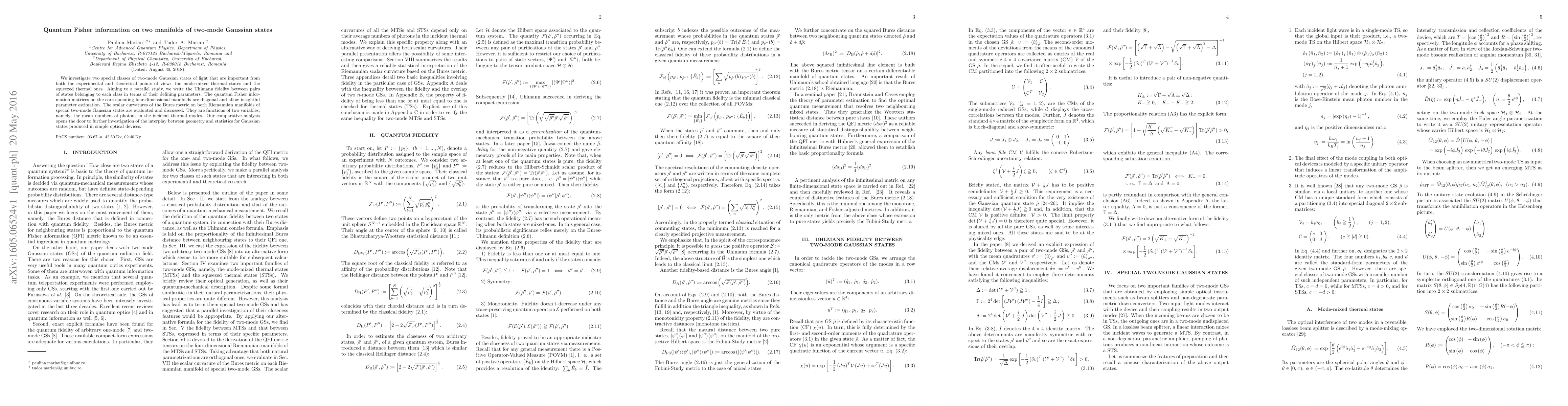 This paper examines two-mode Gaussian states—mode-mixed thermal and squeezed thermal—by analyzing their quantum Fisher information matrices and Uhlmann fidelity. The study reveals diagonal Fisher information matrices and evaluates the scalar curvatures of the Bures metric on the corresponding Riemannian manifolds, providing insights into parameter estimation and the interplay between geometry and statistics in optical devices.
