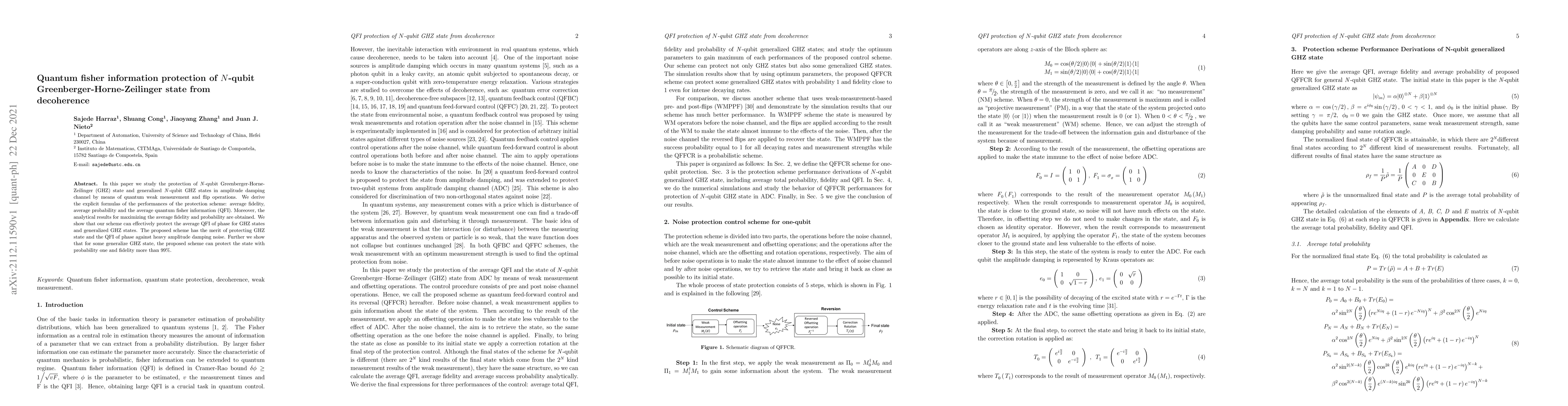 This paper proposes a protection scheme using quantum weak measurement and flip operations to safeguard N-qubit Greenberger-Horne-Zeilinger (GHZ) states against amplitude damping channel decoherence. The scheme effectively preserves the average quantum fisher information of phase, achieving high fidelity and probability of protection, including nearly perfect protection for certain generalized GHZ states.