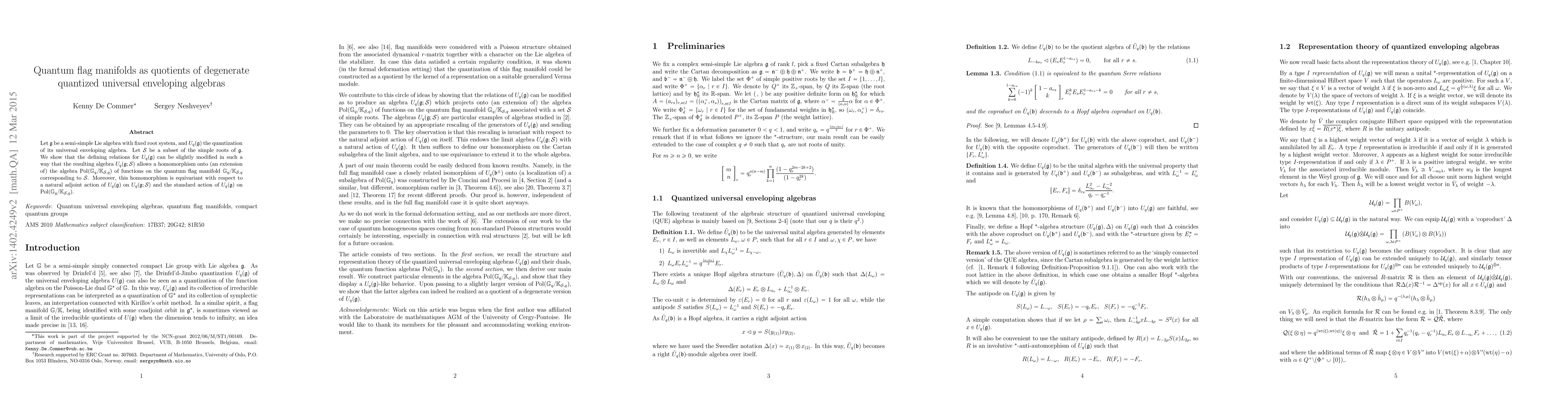 Let $\mathfrak{g}$ be a semi-simple Lie algebra with fixed root system, and $U_q(\mathfrak{g})$ the quantization of its universal enveloping algebra. Let $\mathcal{S}$ be a subset of the simple roots of $\mathfrak{g}$. We show that the defining relations for $U_q(\mathfrak{g})$ can be slightly modified in such a way that the resulting algebra $U_q(\mathfrak{g};\mathcal{S})$ allows a homomorphism onto (an extension of) the algebra $\mathrm{Pol}(\mathbb{G}_q/\mathbb{K}_{\mathcal{S},q})$ of functions on the quantum flag manifold $\mathbb{G}_q/\mathbb{K}_{\mathcal{S},q}$ corresponding to $\mathcal{S}$. Moreover, this homomorphism is equivariant with respect to a natural adjoint action of $U_q(\mathfrak{g})$ on $U_q(\mathfrak{g};\mathcal{S})$ and the standard action of $U_q(\mathfrak{g})$ on $Pol(\mathbb{G}_q/\mathbb{K}_{\mathcal{S},q})$.