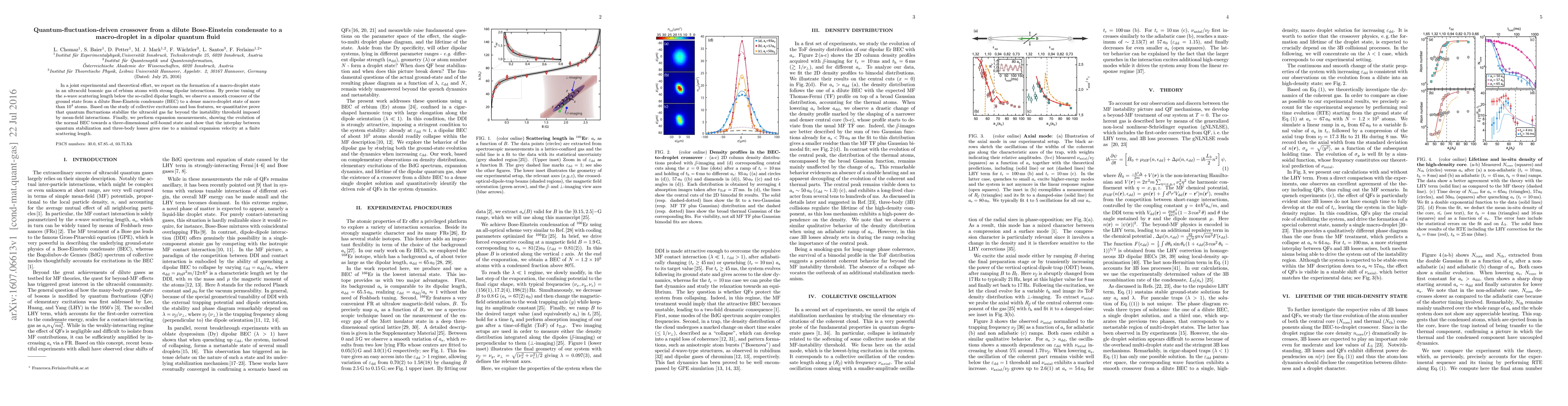This research demonstrates a transition from a dilute Bose-Einstein condensate to a dense macro-droplet in an ultracold erbium gas, driven by quantum fluctuations and dipolar interactions. The study reveals a minimal expansion velocity at a specific scattering length, highlighting the stabilization effects beyond mean-field predictions.