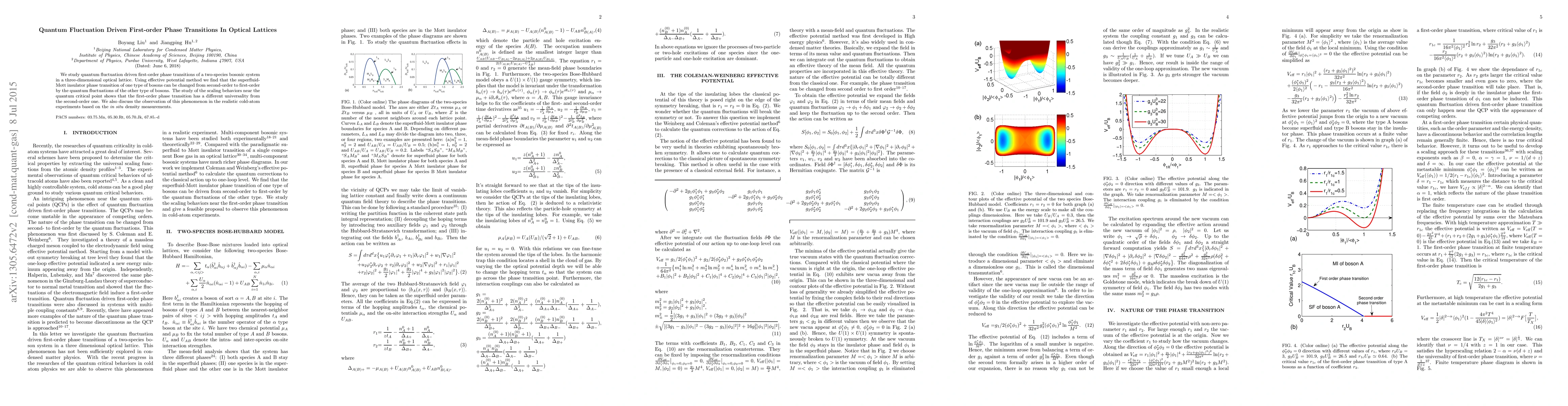 This paper investigates how quantum fluctuations can induce first-order phase transitions in a two-species bosonic system within a three-dimensional optical lattice, transforming the superfluid-Mott insulator transition of one species from second-order to first-order. The study reveals distinct scaling behaviors and universality classes for first-order transitions compared to second-order ones, with implications for cold-atom experiments.