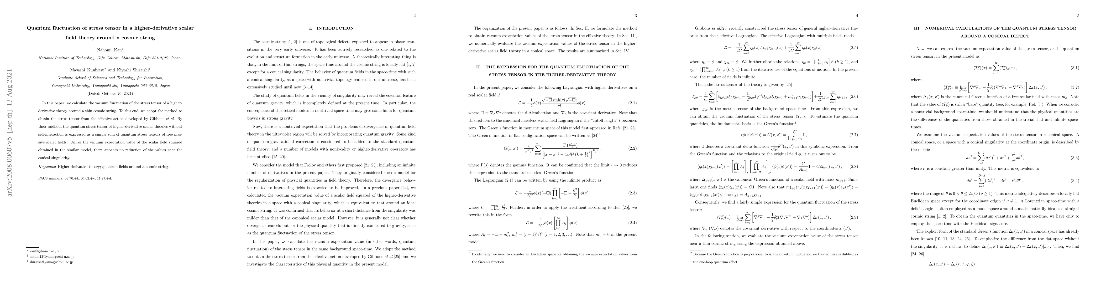 This paper calculates the quantum fluctuations of the stress tensor for a higher-derivative scalar field around a cosmic string, using a method based on the effective action. It finds that, unlike scalar field models, the stress tensor exhibits no reduction near the string's conical singularity.