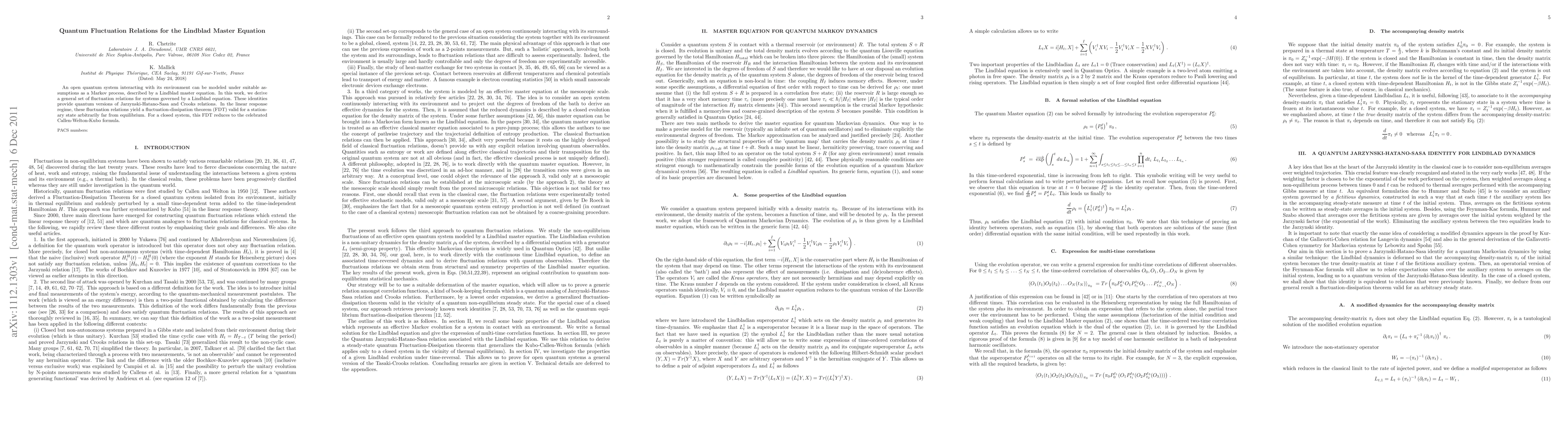 This paper derives quantum fluctuation relations for open quantum systems described by the Lindblad master equation, establishing quantum versions of Jarzynski-Hatano-Sasa and Crooks relations, and a fluctuation-dissipation theorem valid for non-equilibrium stationary states. The derived FDT generalizes to the Callen-Welton-Kubo formula for closed systems.