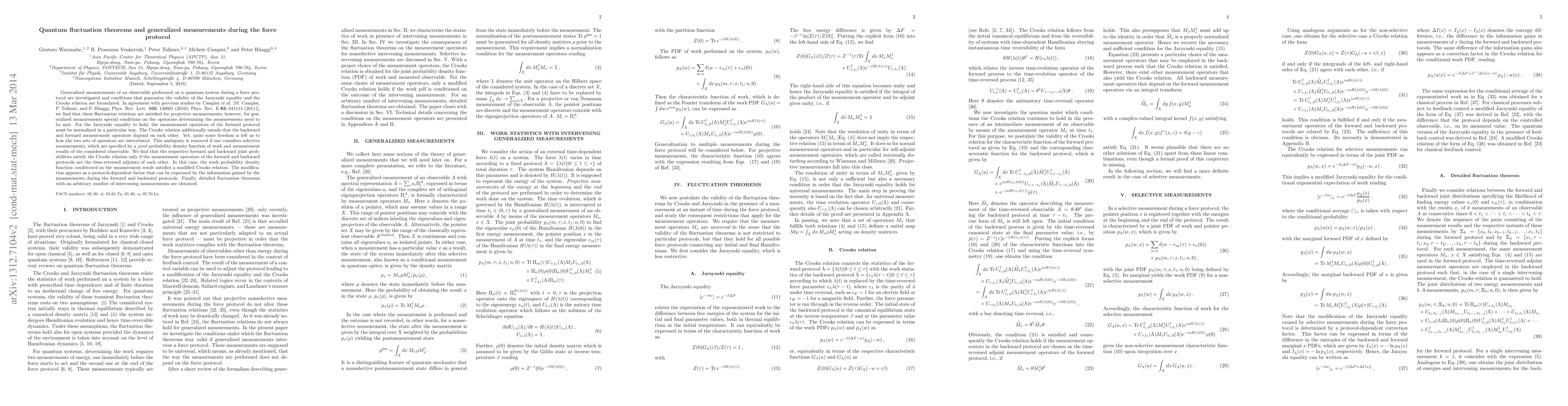 This paper investigates the conditions for generalized measurements in quantum systems during force protocols to satisfy the Jarzynski equality and Crooks relation. It finds that while projective measurements suffice, generalized measurements require specific normalization and interrelation of measurement operators, with selective measurements providing a clearer framework for these fluctuation relations.