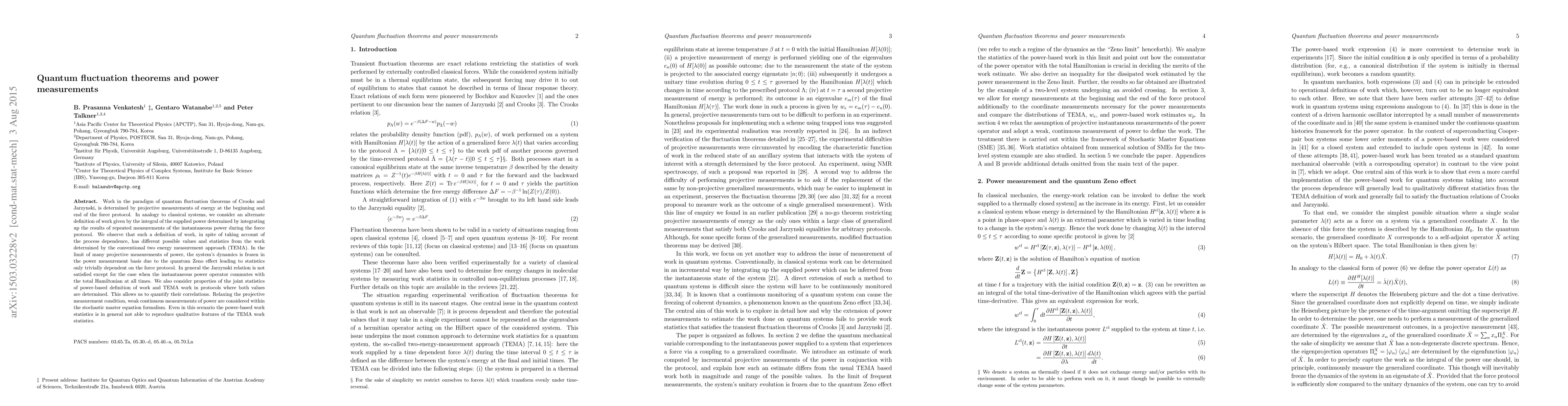 This paper explores quantum fluctuation theorems in the context of power measurements, comparing work defined by integrating instantaneous power to conventional energy measurement approaches. It finds that while both definitions account for process dependence, they yield different statistics, with the power-based definition failing to satisfy the Jarzynski relation in general.
