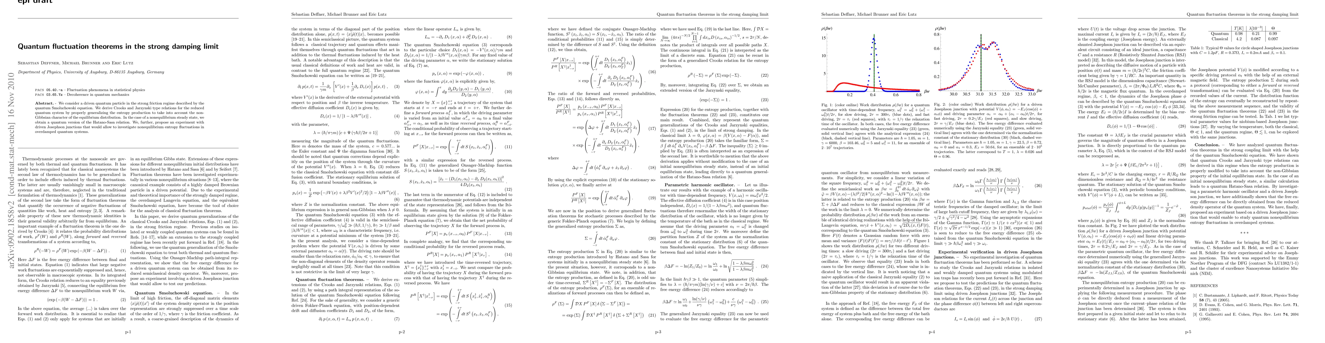 We consider a driven quantum particle in the strong friction regime described by the quantum Smoluchowski equation. We derive Crooks and Jarzynski type relations for the reduced quantum system by properly generalizing the entropy production to take into account the non-Gibbsian character of the equilibrium distribution. In the case of a nonequilibrium steady state, we obtain a quantum version of the Hatano-Sasa relation. We, further, propose an experiment with driven Josephson junctions that would allow to investigate nonequilibrium entropy fluctuations in overdamped quantum systems.