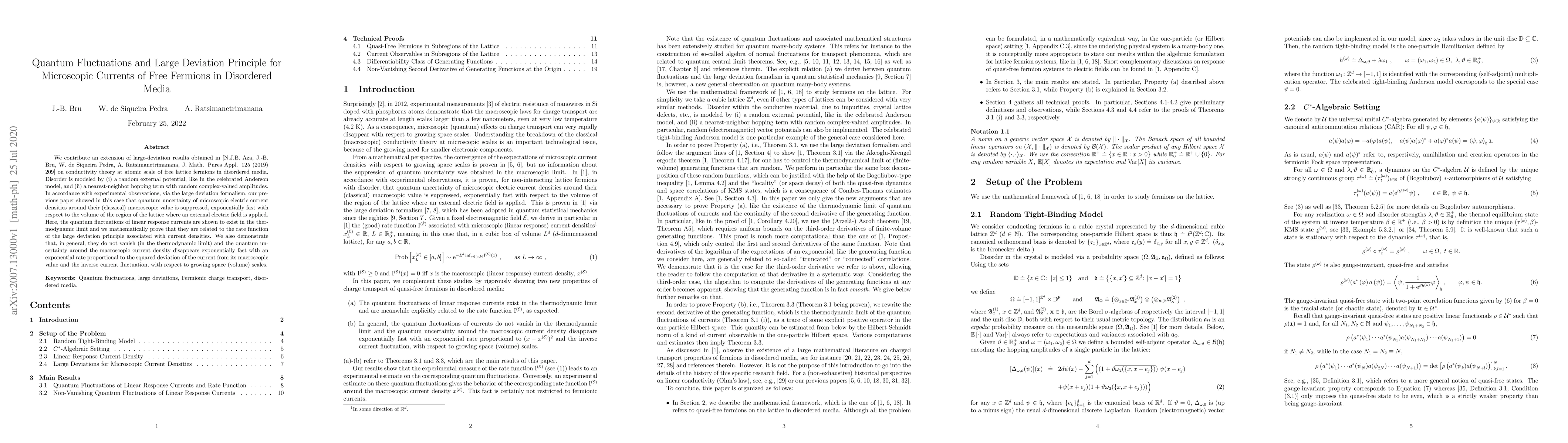 We contribute an extension of large-deviation results obtained in [N.J.B. Aza, J.-B. Bru, W. de Siqueira Pedra, A. Ratsimanetrimanana, J. Math. Pures Appl. 125 (2019) 209] on conductivity theory at atomic scale of free lattice fermions in disordered media. Disorder is modeled by (i) a random external potential, like in the celebrated Anderson model, and (ii) a nearest-neighbor hopping term with random complex-valued amplitudes. In accordance with experimental observations, via the large deviation formalism, our previous paper showed in this case that quantum uncertainty of microscopic electric current densities around their (classical) macroscopic value is suppressed, exponentially fast with respect to the volume of the region of the lattice where an external electric field is applied. Here, the quantum fluctuations of linear response currents are shown to exist in the thermodynamic limit and we mathematically prove that they are related to the rate function of the large deviation principle associated with current densities. We also demonstrate that, in general, they do not vanish (in the thermodynamic limit) and the quantum uncertainty around the macroscopic current density disappears exponentially fast with an exponential rate proportional to the squared deviation of the current from its macroscopic value and the inverse current fluctuation, with respect to growing space (volume) scales.