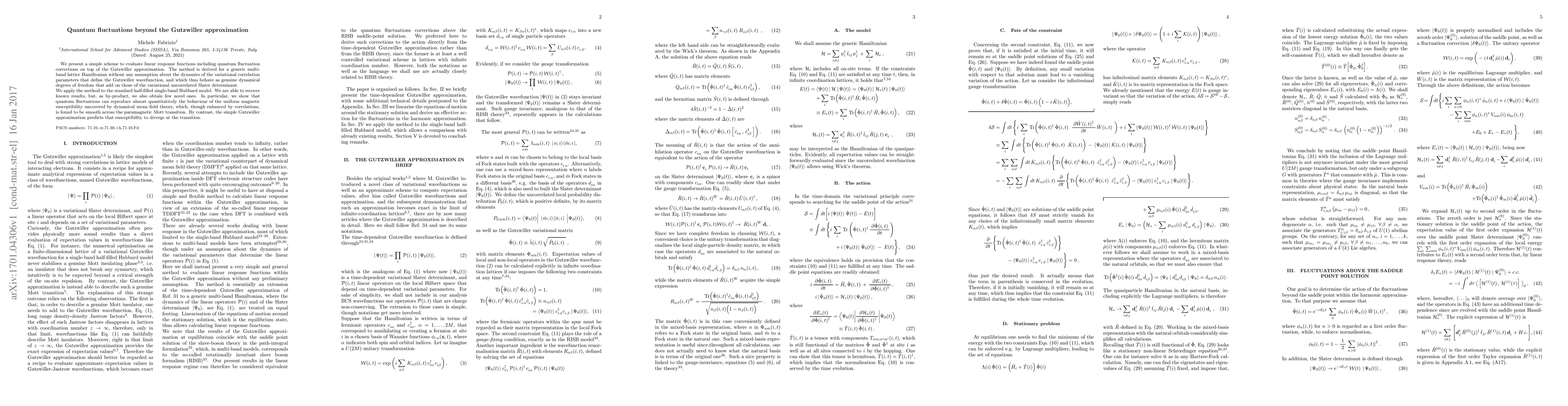 We present a simple scheme to evaluate linear response functions including quantum fluctuation corrections on top of the Gutzwiller approximation. The method is derived for a generic multi-band lattice Hamiltonian without any assumption about the dynamics of the variational correlation parameters that define the Gutzwiller wavefunction, and which thus behave as genuine dynamical degrees of freedom that add on those of the variational uncorrelated Slater determinant. We apply the method to the standard half-filled single-band Hubbard model. We are able to recover known results, but, as by-product, we also obtain few novel ones. In particular, we show that quantum fluctuations can reproduce almost quantitatively the behaviour of the uniform magnetic susceptibility uncovered by dynamical mean field theory, which, though enhanced by correlations, is found to be smooth across the paramagnetic Mott transition. By contrast, the simple Gutzwiller approximation predicts that susceptibility to diverge at the transition.
