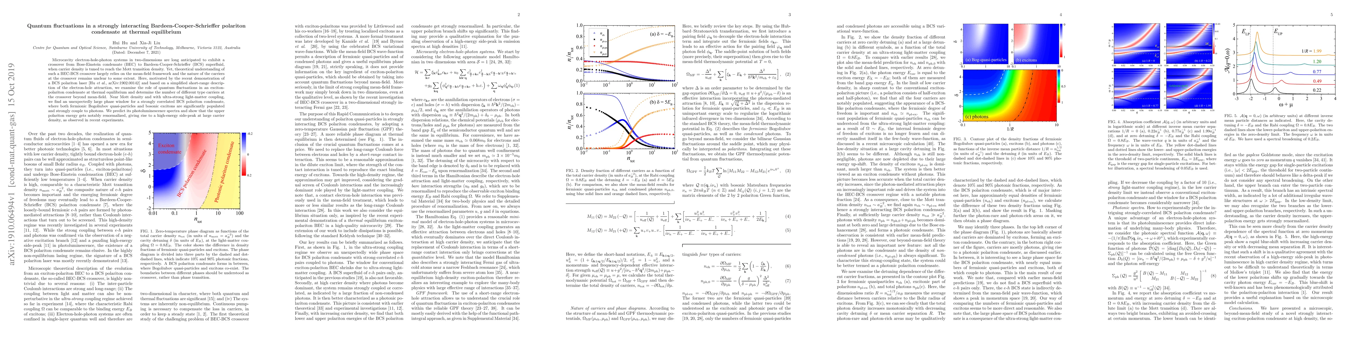 This paper explores quantum fluctuations in a strongly interacting exciton-polariton condensate at thermal equilibrium, revealing a large phase window for a correlated BCS state near the Mott density. The study predicts significant renormalization of the upper polariton energy, resulting in a high-energy side-peak in photoluminescence spectra, consistent with recent experimental observations.