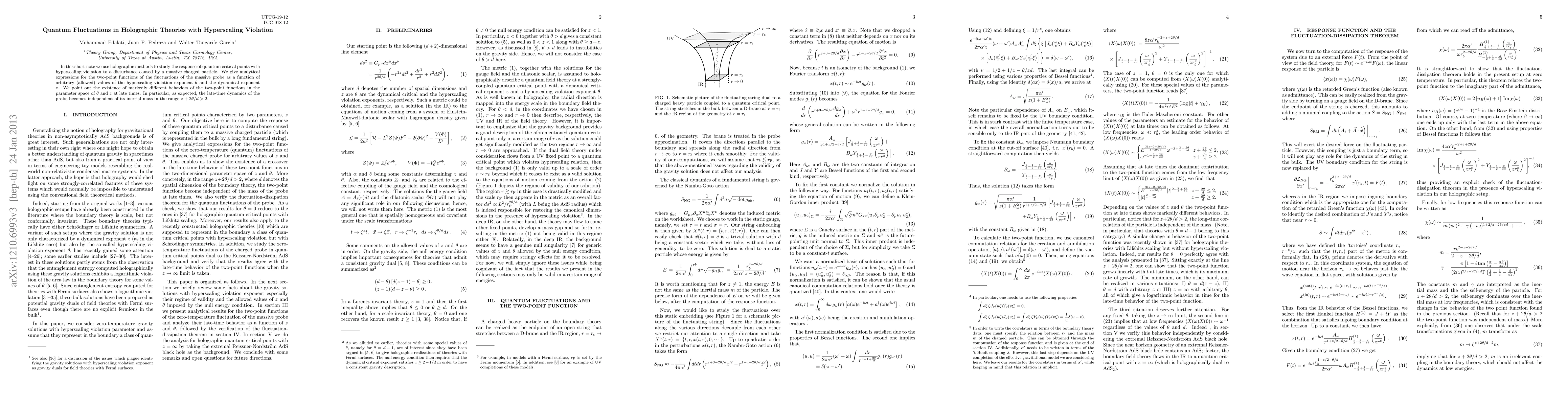 This paper employs holographic methods to analyze the response of quantum critical points with hyperscaling violation to disturbances from massive charged particles, providing analytical expressions for the fluctuations' two-point functions. It highlights distinct behaviors in the parameter space of hyperscaling violation and dynamical exponents, particularly noting that late-time dynamics become mass-independent under certain conditions.