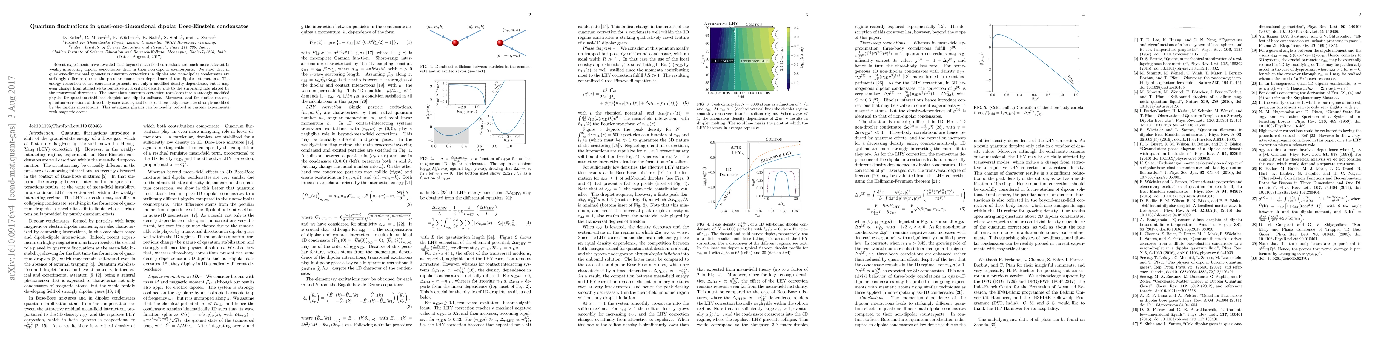 This paper investigates quantum fluctuations in quasi-one-dimensional dipolar Bose-Einstein condensates, revealing that beyond-mean-field corrections significantly differ due to the unique momentum dependence of dipolar interactions. The study finds that quantum corrections can transform the energy correction from attractive to repulsive, impacting the stability of droplets and solitons.
