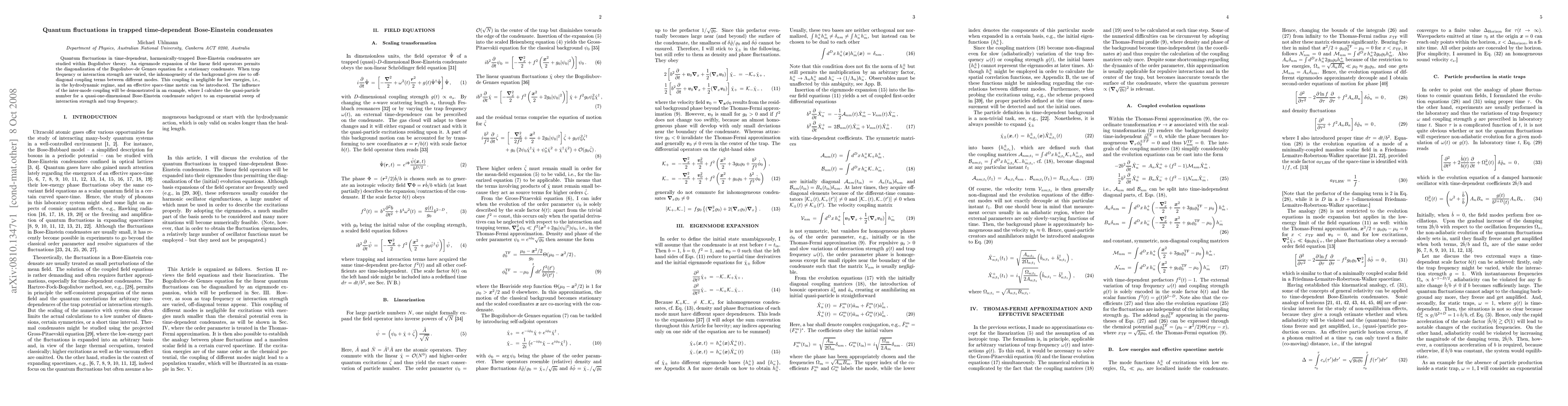 Quantum fluctuations in time-dependent, harmonically-trapped Bose-Einstein condensates are studied within Bogoliubov theory. An eigenmode expansion of the linear field operators permits the diagonalization of the Bogoliubov-de Gennes equation for a stationary condensate. When trap frequency or interaction strength are varied, the inhomogeneity of the background gives rise to off-diagonal coupling terms between different modes. This coupling is negligible for low energies, i.e., in the hydrodynamic regime, and an effective space-time metric can be introduced. The influence of the inter-mode coupling will be demonstrated in an example, where I calculate the quasi-particle number for a quasi-one-dimensional Bose-Einstein condensate subject to an exponential sweep of interaction strength and trap frequency.