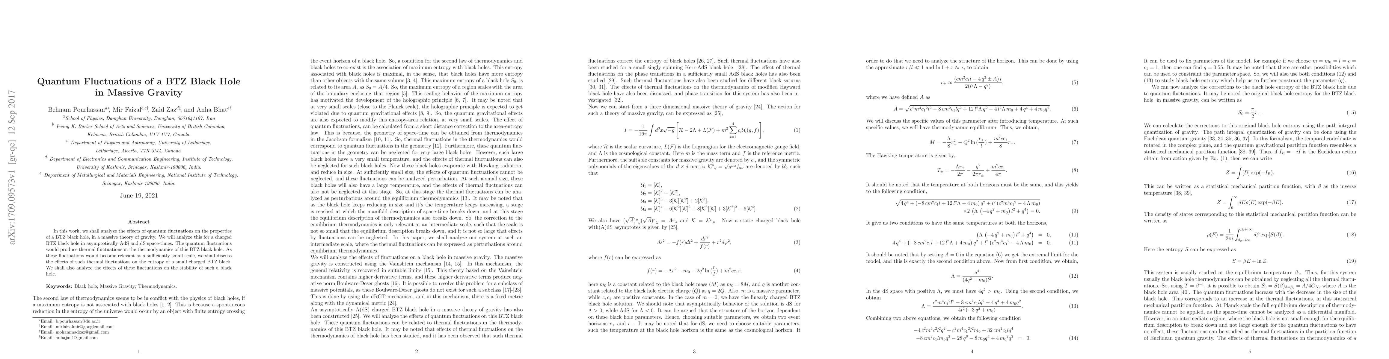 In this work, we shall analyze the effects of quantum fluctuations on the properties of a BTZ black hole, in a massive theory of gravity. We will analyze this for a charged BTZ black hole in asymptotically AdS and dS space-times. The quantum fluctuations would produce thermal fluctuations in the thermodynamics of this BTZ black hole. As these fluctuations would become relevant at a sufficiently small scale, we shall discuss the effects of such thermal fluctuations on the entropy of a small charged BTZ black. We shall also analyze the effects of these fluctuations on the stability of such a black hole.