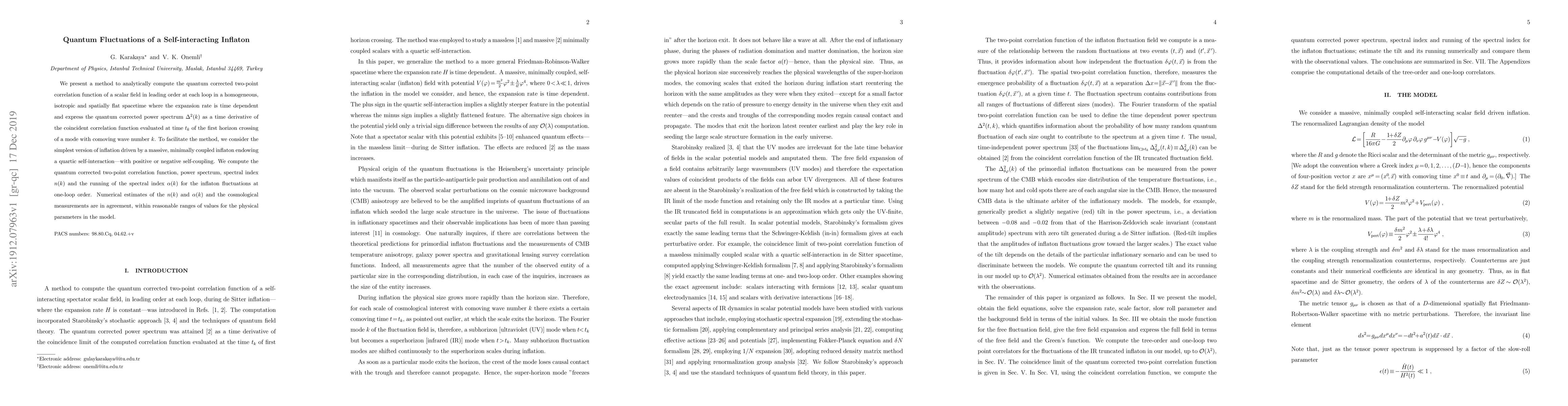 We present a method to analytically compute the quantum corrected two-point correlation function of a scalar field in leading order at each loop in a homogeneous, isotropic and spatially flat spacetime where the expansion rate is time dependent and express the quantum corrected power spectrum $\Delta^2(k)$ as a time derivative of the coincident correlation function evaluated at time $t_k$ of the first horizon crossing of a mode with comoving wave number $k$. To facilitate the method, we consider the simplest version of inflation driven by a massive, minimally coupled inflaton endowing a quartic self-interaction---with positive or negative self-coupling. We compute the quantum corrected two-point correlation function, power spectrum, spectral index $n(k)$ and the running of the spectral index $\alpha(k)$ for the inflaton fluctuations at one-loop order. Numerical estimates of the $n(k)$ and $\alpha(k)$ and the cosmological measurements are in agreement, within reasonable ranges of values for the physical parameters in the model.