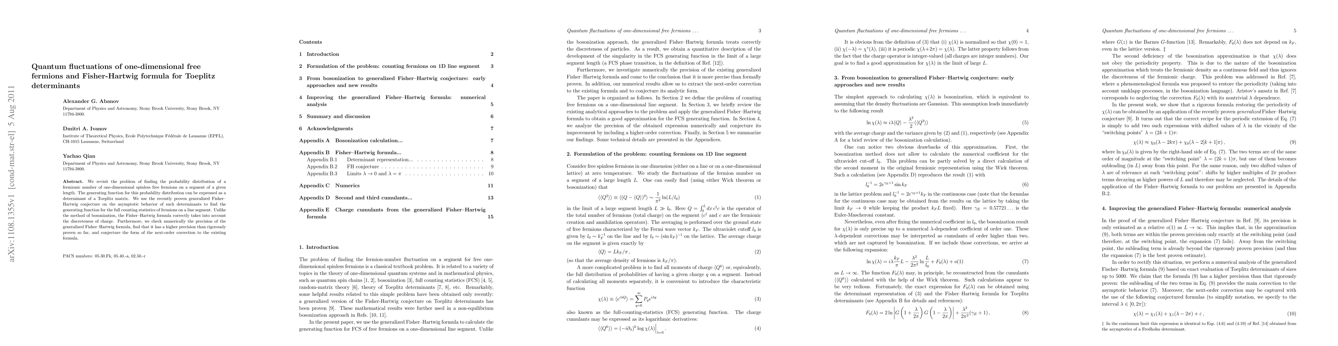 This paper investigates the probability distribution of a fermionic number in one-dimensional free fermions using Toeplitz determinants, and applies the generalized Fisher-Hartwig conjecture to derive the generating function. The Fisher-Hartwig formula is shown to be more precise than bosonization methods, and numerical checks support its accuracy with a conjecture for next-order corrections.