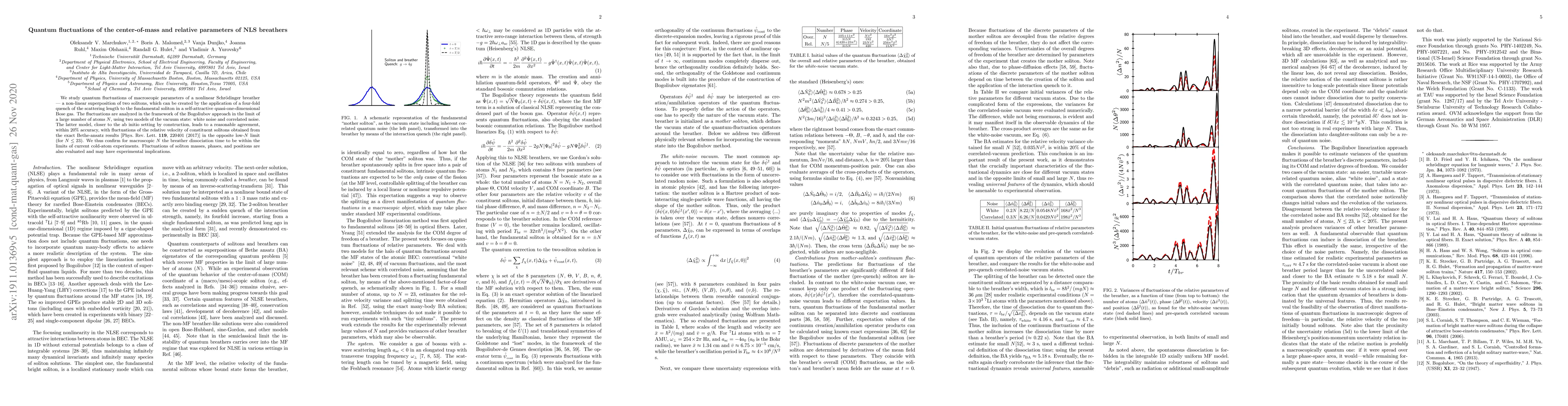 We study quantum fluctuations of macroscopic parameters of an NLS breathers, i.e., the second-order soliton solution of the nonlinear Schr\"odinger equation. Uncertainty relations for the parameters are derived and compared to similar relations for fundamental solitons. We compare two models for the state of the quantum field of fluctuations surrounding the classical field of the Bose-Einstein condensate: a conventionally used, computationally convenient "white noise", and a correlated noise which assumes that the breather has been created from a fundamental soliton, by means of the application of the factor-of-four quench of the nonlinearity strength. Theoretical methods used in the work are well suited for a large number of particles, $N$. We thus confirm the possibility of experimental observation of macroscopic quantum fluctuations, which is suggested by an extrapolation to large $N$ of recently reported low-$N$ Bethe-ansatz results [Phys. Rev. Lett. 119 220401 (2017)].