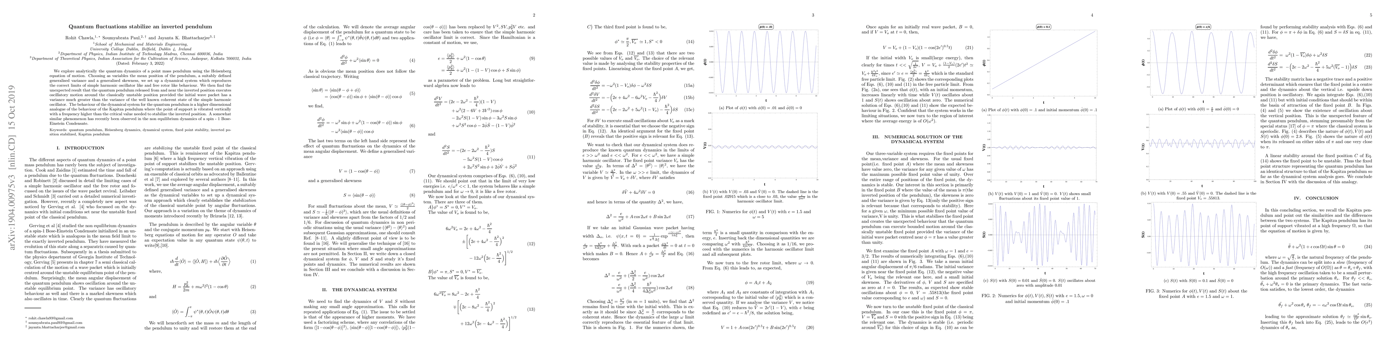 This research paper analytically investigates the quantum dynamics of a point mass pendulum using the Heisenberg equation of motion, finding that quantum fluctuations can stabilize an inverted pendulum when the initial wave packet has a sufficiently large variance, analogous to the Kapitza pendulum stabilization effect. The phenomenon mirrors recent observations in non-equilibrium dynamics of spin-1 Bose-Einstein condensates.