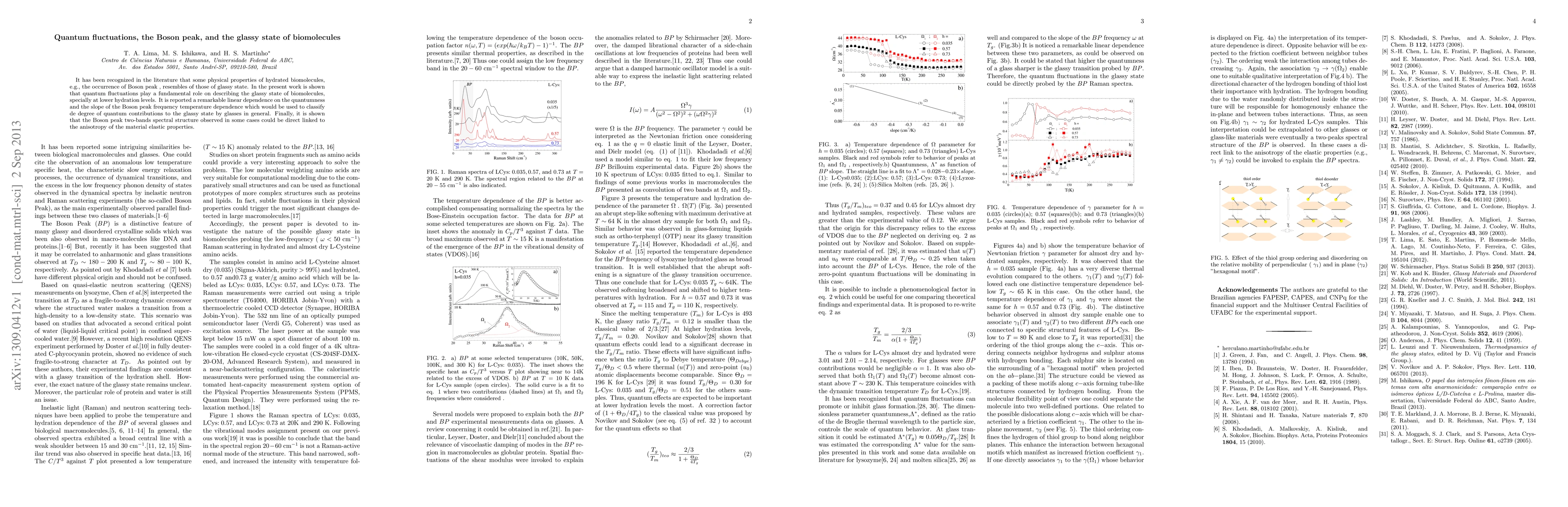 It has been recognized in the literature that some physical properties of hydrated biomolecules, e.g., the occurrence of Boson peak, resembles of those of glassy state. In the present work is shown that quantum fluctuations play a fundamental role on describing the glassy state of biomolecules, specially at lower hydration levels. It is reported a remarkable linear dependence on the quantumness and the slope of the Boson peak frequency temperature dependence which would be used to classify de degree of quantum contributions to the glassy state by glasses in general. Finally, it is shown that the Boson peak two-bands spectral structure observed in some cases could be direct linked to the anisotropy of the material elastic properties.