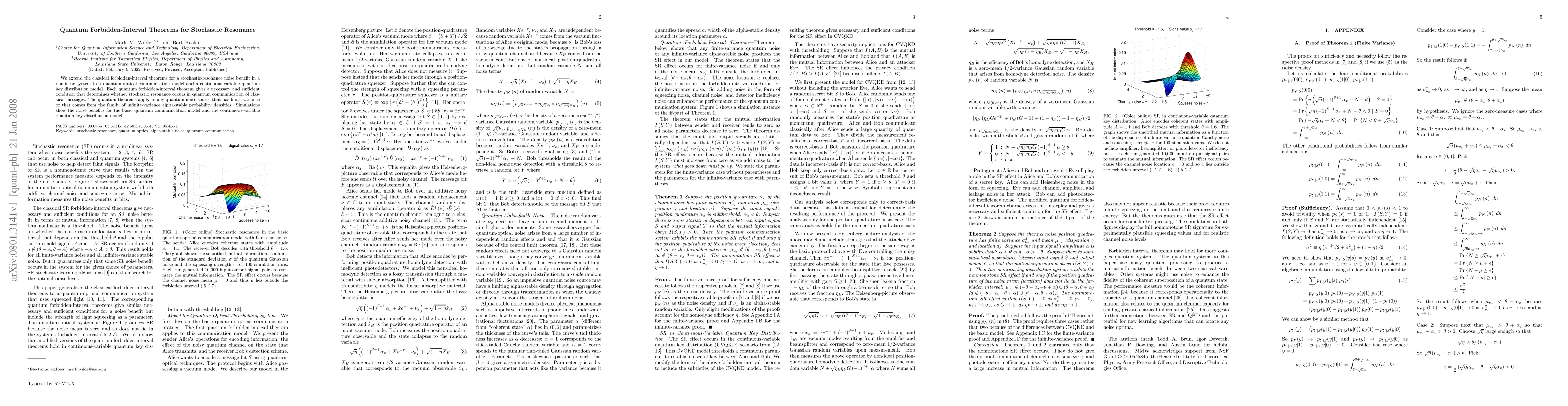 We extend the classical forbidden-interval theorems for a stochastic-resonance noise benefit in a nonlinear system to a quantum-optical communication model and a continuous-variable quantum key distribution model. Each quantum forbidden-interval theorem gives a necessary and sufficient condition that determines whether stochastic resonance occurs in quantum communication of classical messages. The quantum theorems apply to any quantum noise source that has finite variance or that comes from the family of infinite-variance alpha-stable probability densities. Simulations show the noise benefits for the basic quantum communication model and the continuous-variable quantum key distribution model.