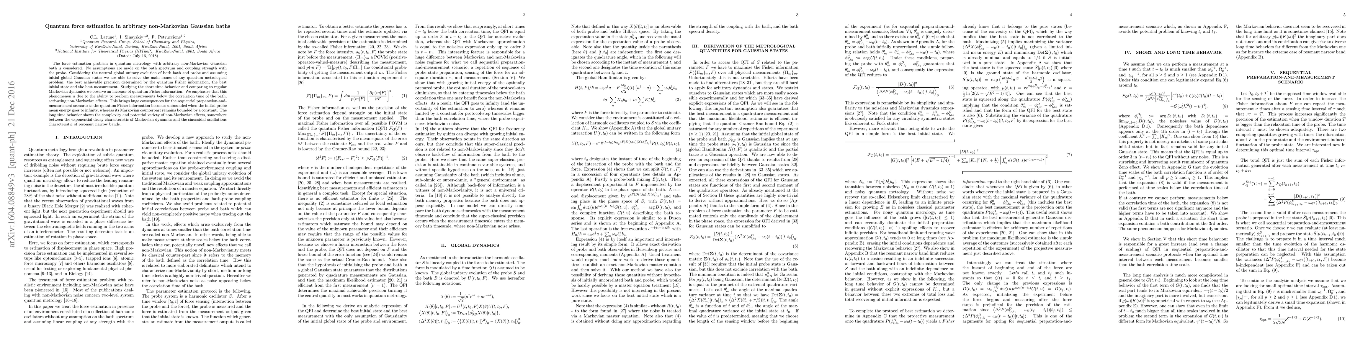 The force estimation problem in quantum metrology with an arbitrary non-Markovian Gaussian bath is considered. No assumptions are made on the bath spectrum and coupling strength with the probe. Considering the natural global unitary evolution of both bath and probe and assuming initial global Gaussian states we are able to solve the main issues of any quantum metrological problem: the best achievable precision determined by the quantum Fisher information, the best initial state and the best measurement. Studying the short time behavior and comparing to regular Markovian dynamics we observe an increase of quantum Fisher information. We emphasize that this phenomenon is due to the ability to perform measurements below the correlation time of the bath, activating non-Markovian effects. This brings huge consequences for the sequential preparation-and- measurement scenario as the quantum Fisher information becomes unbounded when the initial probe mean energy goes to infinity, whereas its Markovian counterpart remains bounded by a constant. The long time behavior shows the complexity and potential variety of non-Markovian effects, somewhere between the exponential decay characteristic of Markovian dynamics and the sinusoidal oscillations characteristic of resonant narrow bands.