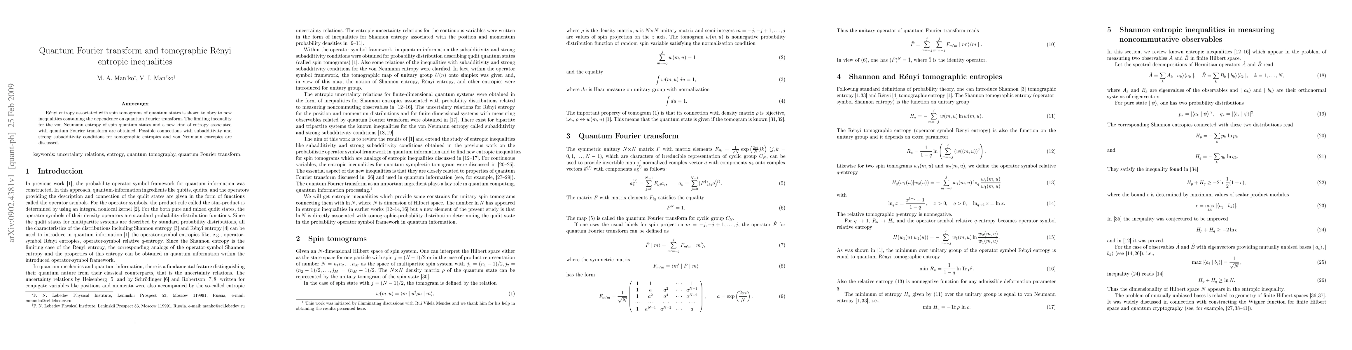 Renyi entropy associated with spin tomograms of quantum states is shown to obey to new inequalities containing the dependence on quantum Fourier transform. The limiting inequality for the von Neumann entropy of spin quantum states and a new kind of entropy associated with quantum Fourier transform are obtained. Possible connections with subadditivity and strong subadditivity conditions for tomographic entropies and von Neumann entropies are discussed.