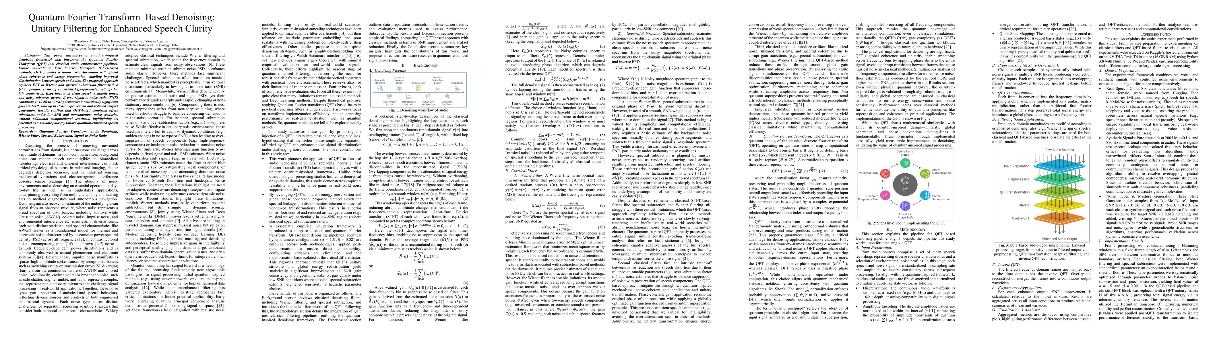 This paper introduces a quantum-inspired denoising framework that integrates the Quantum Fourier Transform (QFT) into classical audio enhancement pipelines. Unlike conventional Fast Fourier Transform (FFT) based methods, QFT provides a unitary transformation with global phase coherence and energy preservation, enabling improved discrimination between speech and noise. The proposed approach replaces FFT in Wiener and spectral subtraction filters with a QFT operator, ensuring consistent hyperparameter settings for fair comparison. Experiments on clean speech, synthetic tones, and noisy mixtures across diverse signal to noise ratio (SNR) conditions, demonstrate statistically significant gains in SNR, with up to 15 dB improvement and reduced artifact generation. Results confirm that QFT based denoising offers robustness under low SNR and nonstationary noise scenarios without additional computational overhead, highlighting its potential as a scalable pathway toward quantum-enhanced speech processing.