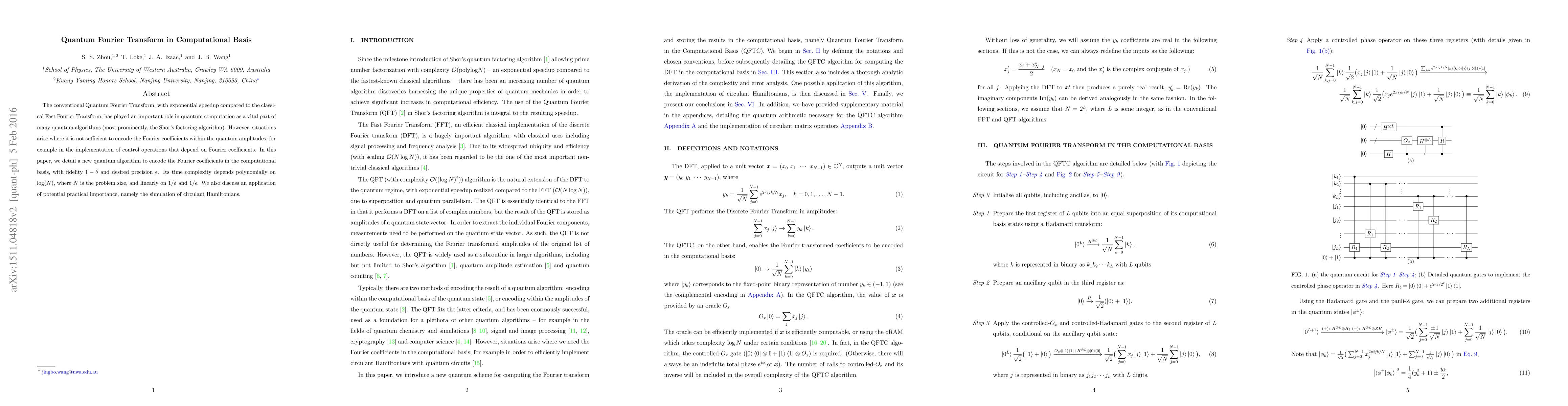 The conventional Quantum Fourier Transform, with exponential speedup compared to the classical Fast Fourier Transform, has played an important role in quantum computation as a vital part of many quantum algorithms (most prominently, the Shor's factoring algorithm). However, situations arise where it is not sufficient to encode the Fourier coefficients within the quantum amplitudes, for example in the implementation of control operations that depend on Fourier coefficients. In this paper, we detail a new quantum algorithm to encode the Fourier coefficients in the computational basis, with success probability $1-\delta$ and desired precision $\epsilon$. Its time complexity %$\mathcal{O}\big((\log N)^2\log(N/\delta)/\epsilon)\big)$ depends polynomially on $\log(N)$, where $N$ is the problem size, and linearly on $\log(1/\delta)$ and $1/\epsilon$. We also discuss an application of potential practical importance, namely the simulation of circulant Hamiltonians.