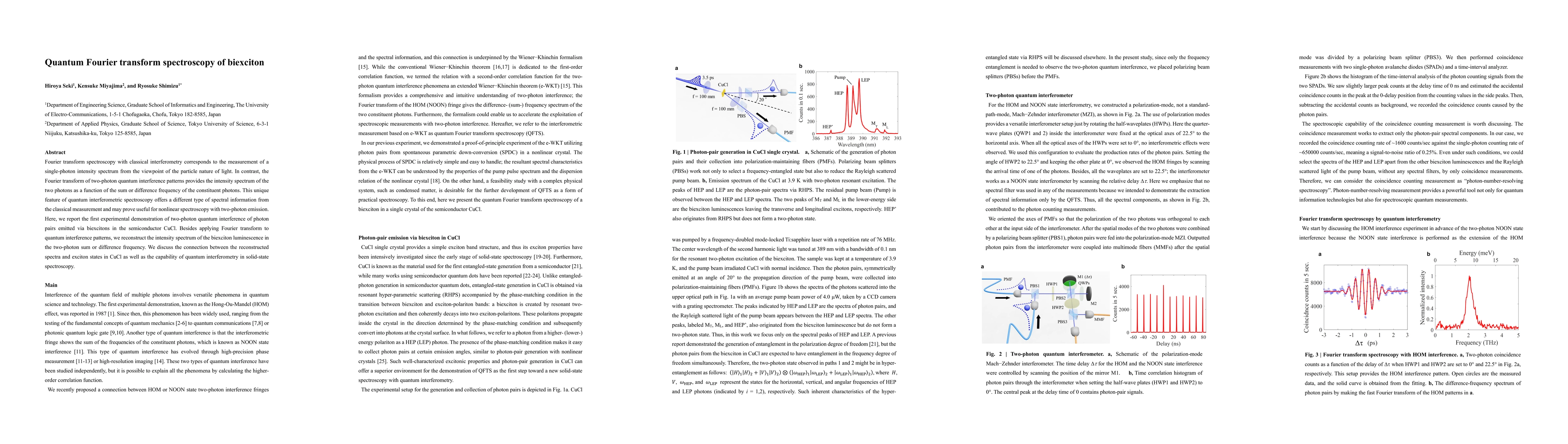 This paper demonstrates the first experimental use of quantum Fourier transform spectroscopy to analyze biexciton luminescence in semiconductor CuCl, revealing the two-photon sum or difference frequency intensity spectrum, which provides unique spectral information compared to classical interferometry. The study highlights the potential of quantum interferometry for solid-state spectroscopy.