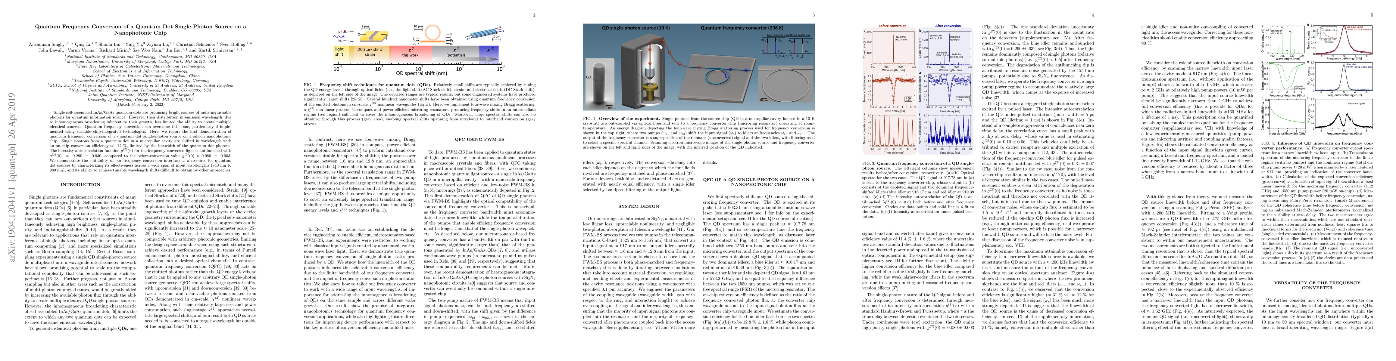 This paper demonstrates the first quantum frequency conversion of a quantum dot single-photon source on a silicon nanophotonic chip, achieving an on-chip conversion efficiency of approximately 12%. The frequency-converted photons exhibit antibunching, confirming their suitability for quantum information science applications.