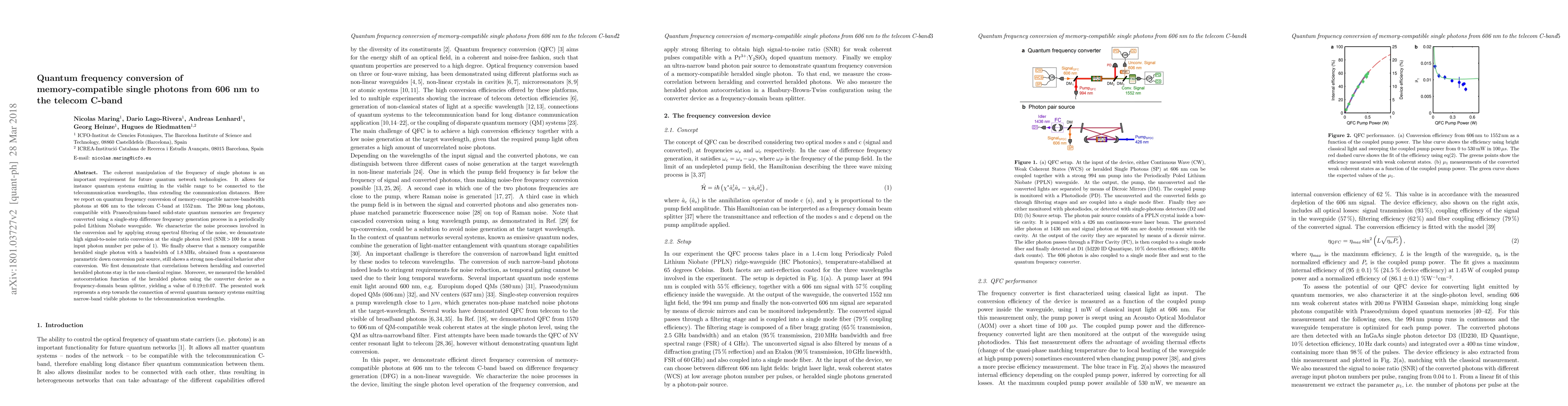 We report on quantum frequency conversion of memory-compatible narrow-bandwidth photons at 606 nm to the telecom C-band at 1552$\,$nm. The 200$\,$ns long photons, compatible with Praseodymium-based solid-state quantum memories are frequency converted using a single-step difference frequency generation process in a periodically poled Lithium Niobate waveguide. We characterize the noise processes involved in the conversion and by applying strong spectral filtering of the noise, we demonstrate high signal-to-noise ratio conversion at the single photon level (SNR$\,>\,$100 for a mean input photon number per pulse of 1). We finally observe that a memory compatible heralded single photon with a bandwidth of 1.8$\,$MHz, obtained from a spontaneous parametric down conversion pair source, still shows a strong non-classical behavior after conversion. We first demonstrate that correlations between heralding and converted heralded photons stay in the non-classical regime. Moreover, we measured the heralded autocorrelation function of the heralded photon using the converter device as a frequency-domain beam splitter, yielding a value of $0.19\pm0.07$. The presented work represents a step towards the connection of several quantum memory systems emitting narrow-band visible photons to the telecommunication wavelengths.