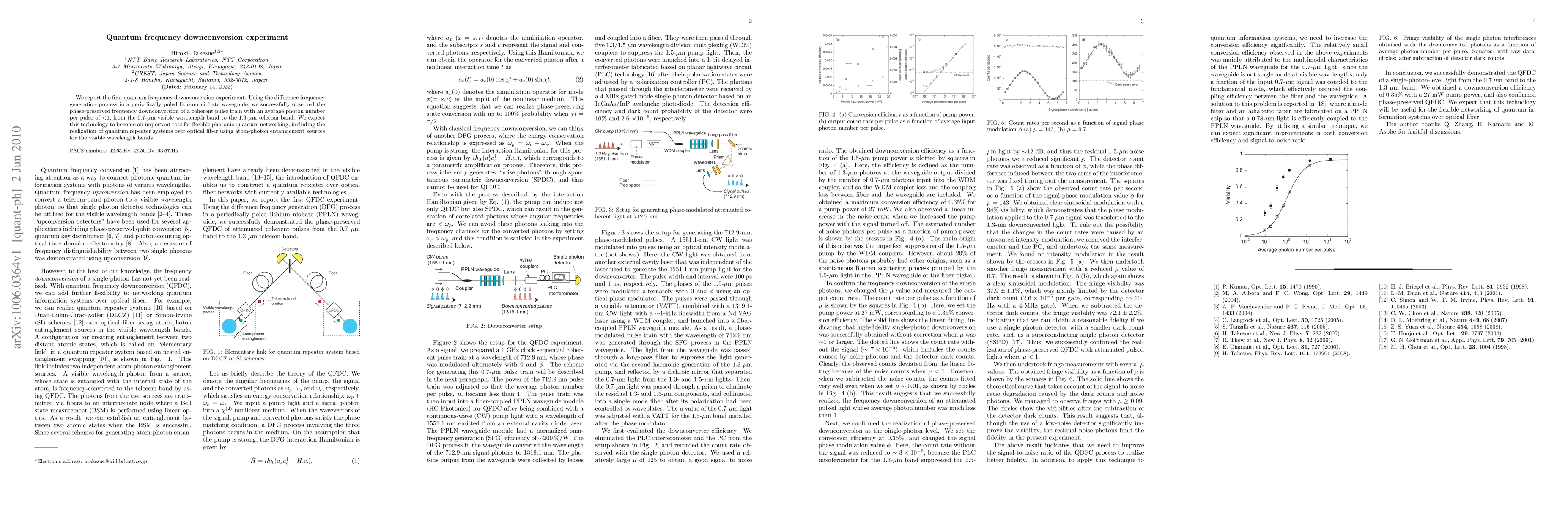 This paper reports the first quantum frequency downconversion experiment, demonstrating the phase-preserved downconversion of coherent pulse trains from the visible to the telecom band using difference frequency generation in a lithium niobate waveguide. This technology is anticipated to advance photonic quantum networking and quantum repeater systems.