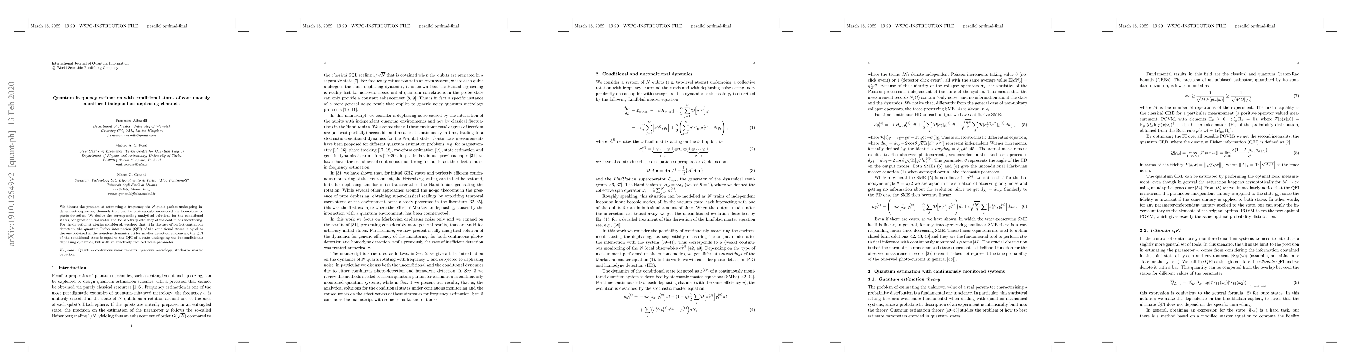 This paper investigates the estimation of a frequency using N-qubit probes subjected to independent dephasing channels, with continuous monitoring via homodyne or photo-detection. It derives analytical solutions for conditional states under various initial conditions and monitoring efficiencies, showing that perfect continuous detection maintains the quantum Fisher information (QFI) of noiseless dynamics, while reduced efficiency results in an effectively lower noise parameter.