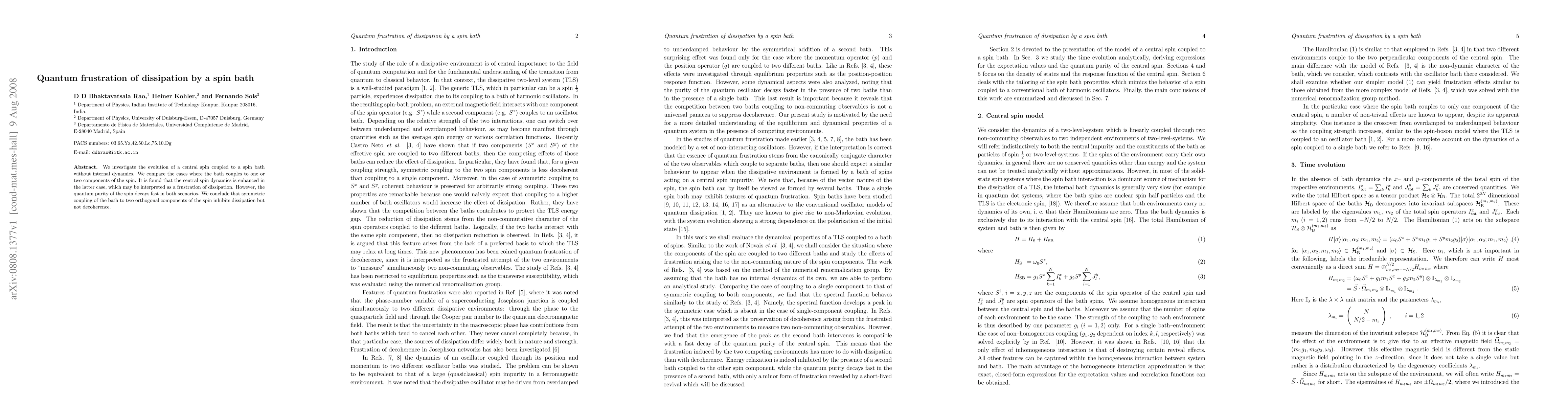This paper explores the dynamics of a central spin interacting with a spin bath, finding that coupling to two components enhances the central spin's dynamics, interpreted as a frustration of dissipation. Despite this, the quantum purity of the spin decays rapidly in both coupling scenarios, indicating that while symmetric coupling inhibits dissipation, it does not prevent decoherence.