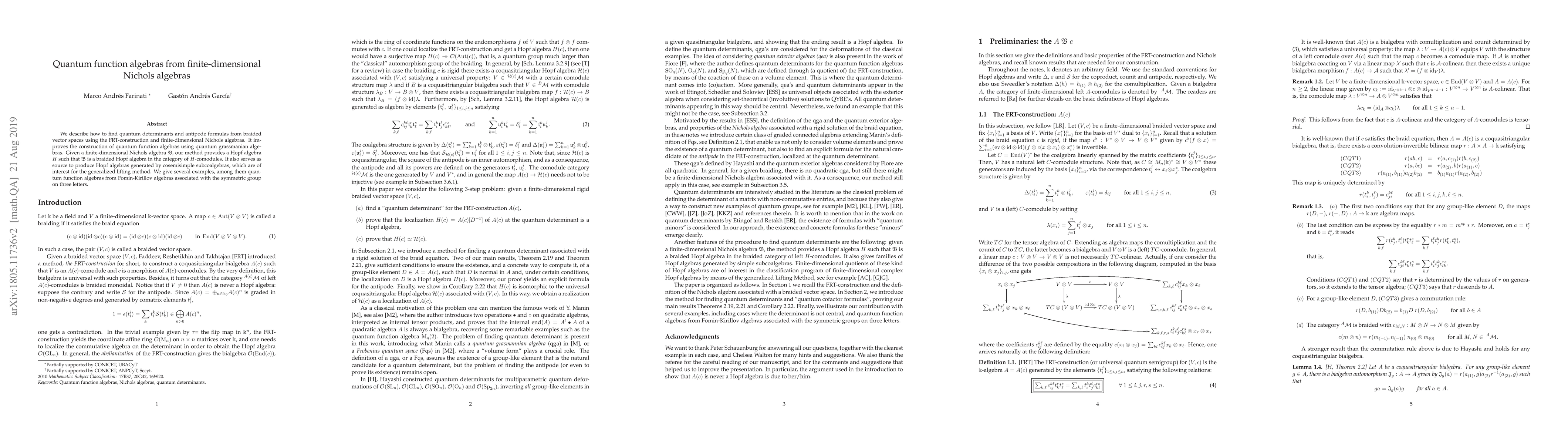 We describe how to find quantum determinants and antipode formulas from braided vector spaces using the FRT-construction and finite-dimensional Nichols algebras. It generalizes the construction of quantum function algebras using quantum grassmanian algebras. Given a finite-dimensional Nichols algebra B, our method provides a Hopf algebra H such that B is a braided Hopf algebra in the category of H-comodules. It also serves as source to produce Hopf algebras generated by cosemisimple subcoalgebras, which are of interest for the generalized lifting method. We give several examples, among them quantum function algebras from Fomin-Kirillov algebras associated with the symmetric groups on three letters.
