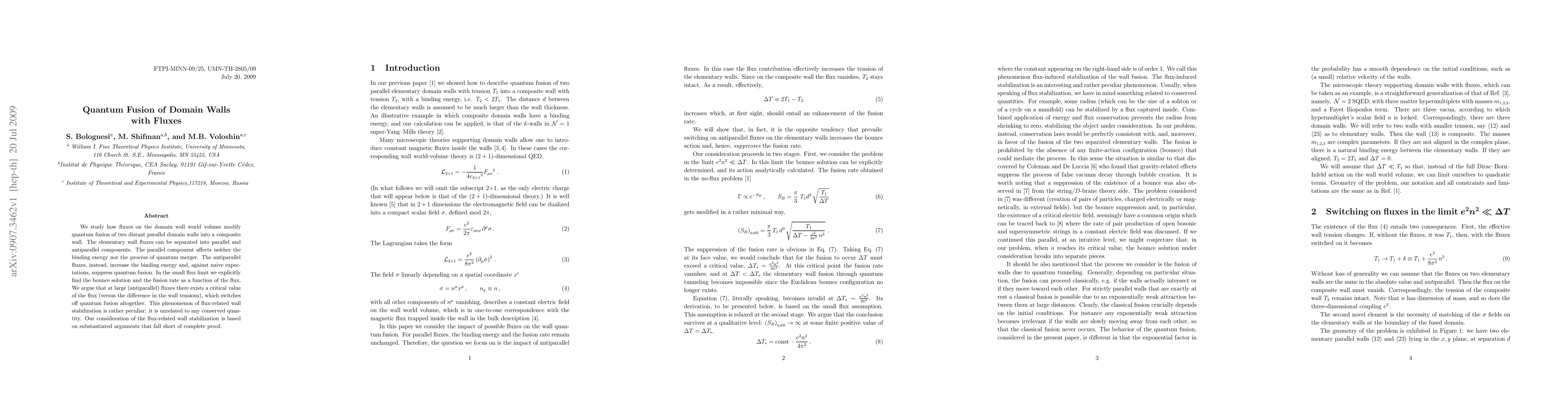 This paper investigates how fluxes on domain walls affect their quantum fusion, finding that antiparallel fluxes increase binding energy and suppress fusion, with a critical flux value that completely halts fusion. The study lacks a complete proof but provides strong arguments for this flux-related stabilization phenomenon.