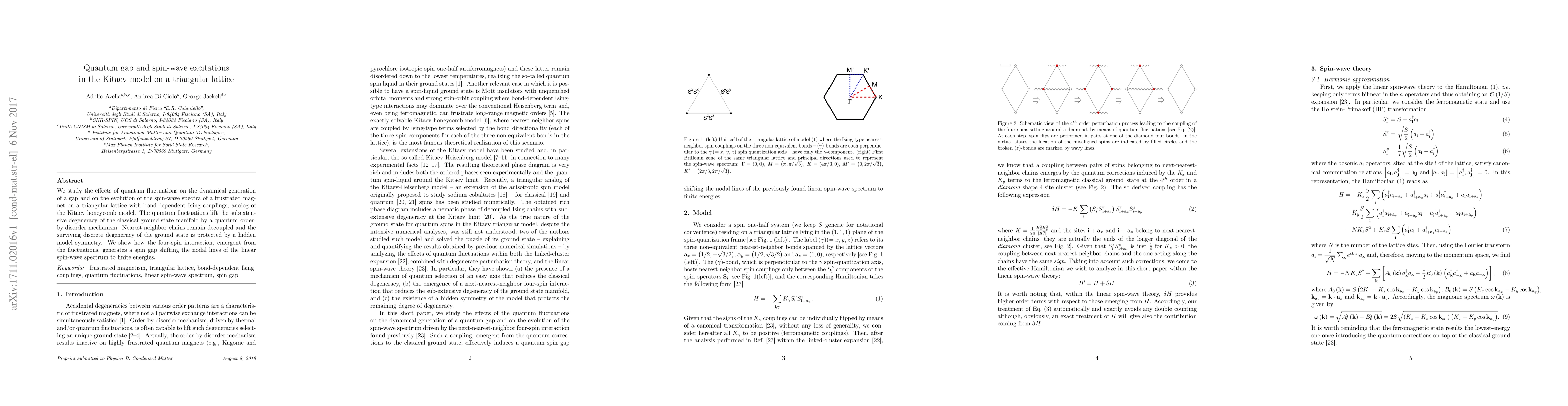 Researchers studied how quantum fluctuations affect a type of magnet on a triangular lattice, finding that they create a gap in the energy spectrum and shift the directions where spin waves can propagate.