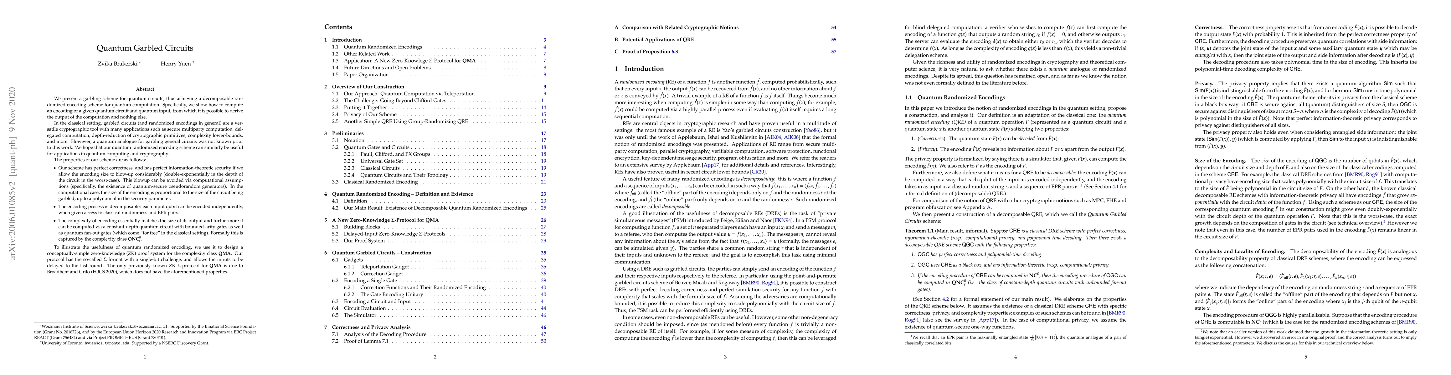 This paper presents a novel garbling scheme for quantum circuits, enabling a decomposable randomized encoding for quantum computation. The scheme allows secure computation without revealing any additional information, and it is used to design a new zero-knowledge proof system for the complexity class $\mathbf{QMA}$, featuring a simpler protocol compared to existing methods.