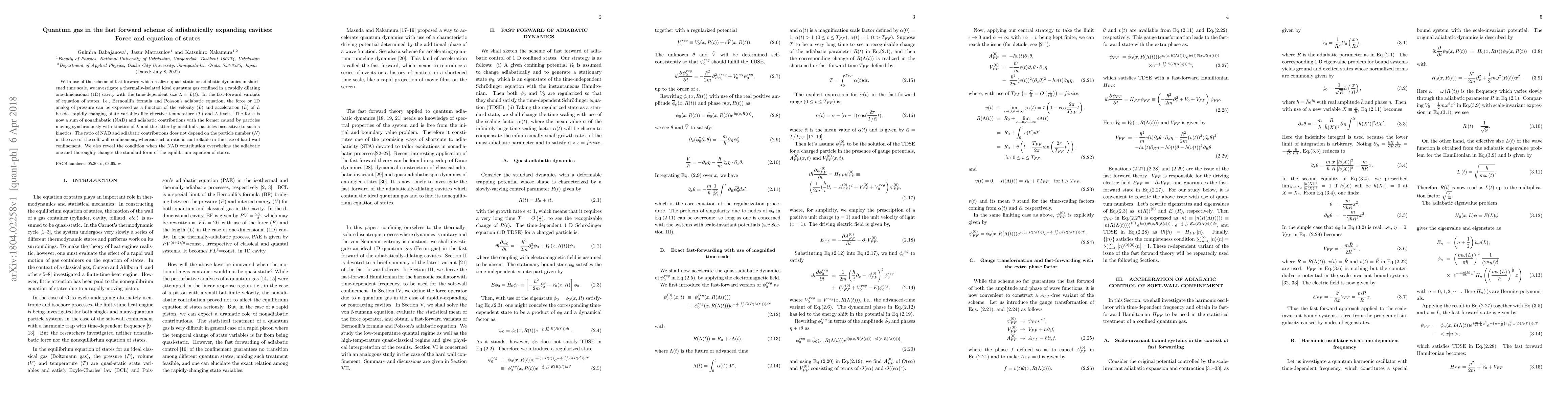 With use of the scheme of fast forward which realizes quasi-static or adiabatic dynamics in shortened time scale, we investigate a thermally-isolated ideal quantum gas confined in a rapidly dilating one-dimensional (1D) cavity with the time-dependent size $L=L(t)$. In the fast-forward variants of equation of states, i.e., Bernoulli's formula and Poisson's adiabatic equation, the force or 1D analog of pressure can be expressed as a function of the velocity ($\dot{L}$) and acceleration ($\ddot{L}$) of $L$ besides rapidly-changing state variables like effective temperature ($T$) and $L$ itself. The force is now a sum of nonadiabatic (NAD) and adiabatic contributions with the former caused by particles moving synchronously with kinetics of $L$ and the latter by ideal bulk particles insensitive to such a kinetics. The ratio of NAD and adiabatic contributions does not depend on the particle number ($N$) in the case of the soft-wall confinement, whereas such a ratio is controllable in the case of hard-wall confinement. We also reveal the condition when the NAD contribution overwhelms the adiabatic one and thoroughly changes the standard form of the equilibrium equation of states.