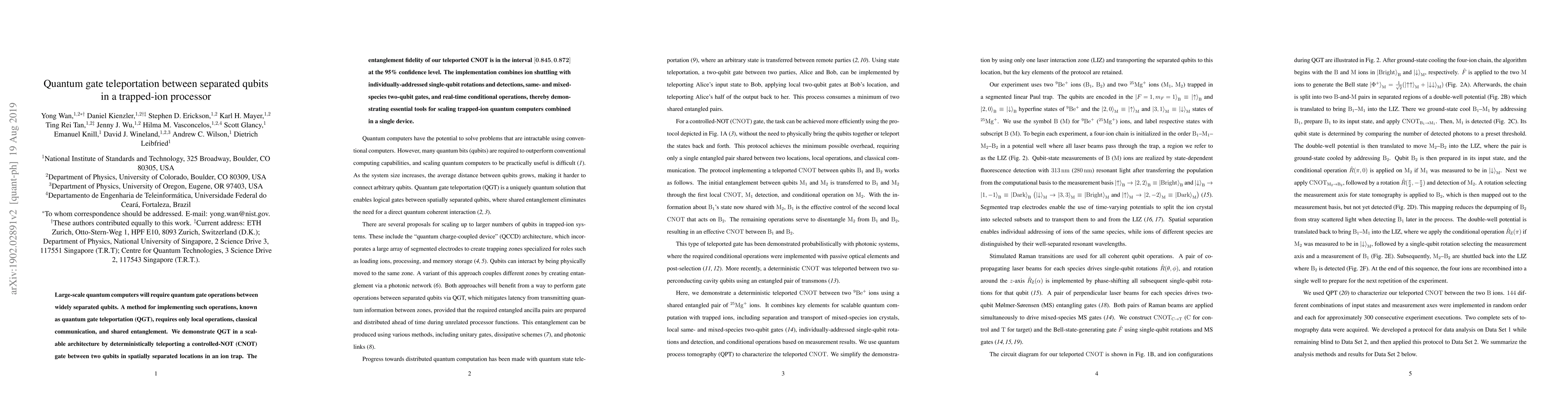 This paper demonstrates quantum gate teleportation (QGT) for a controlled-NOT gate between spatially separated qubits in a trapped-ion processor, achieving entanglement fidelity between 0.845 and 0.872 at 95% confidence. The scalable architecture employs local operations, classical communication, and shared entanglement, showcasing essential tools for future trapped-ion quantum computers.