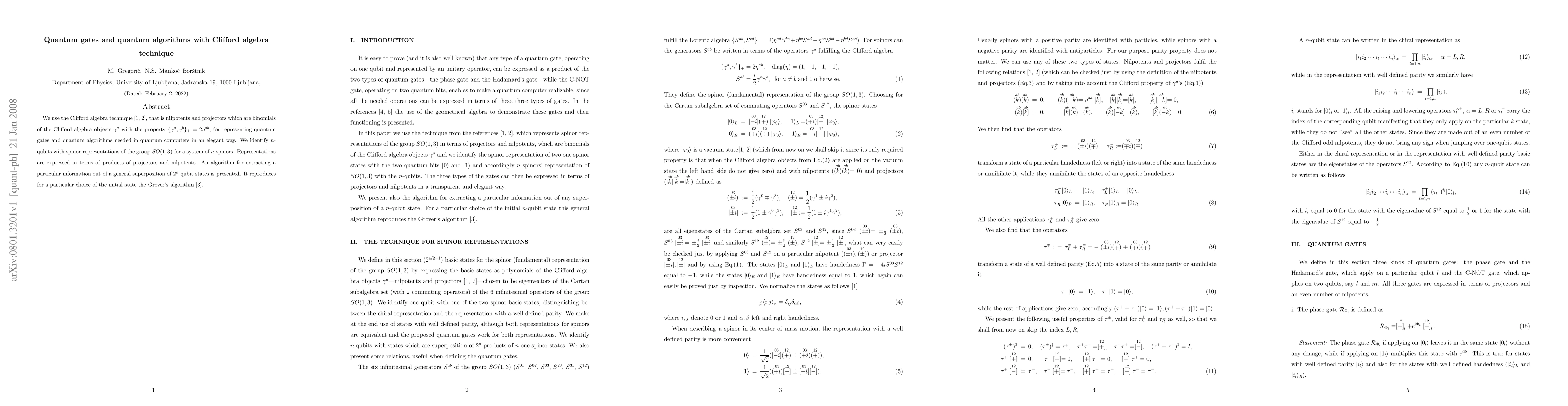 We use our Clifford algebra technique, that is nilpotents and projectors which are binomials of the Clifford algebra objects $\gamma^a$ with the property $\{\gamma^a,\gamma^b\}_+ = 2 \eta^{ab}$, for representing quantum gates and quantum algorithms needed in quantum computers in an elegant way. We identify $n$-qubits with spinor representations of the group SO(1,3) for a system of $n$ spinors. Representations are expressed in terms of products of projectors and nilpotents. An algorithm for extracting a particular information out of a general superposition of $2^n$ qubit states is presented. It reproduces for a particular choice of the initial state the Grover's algorithm.