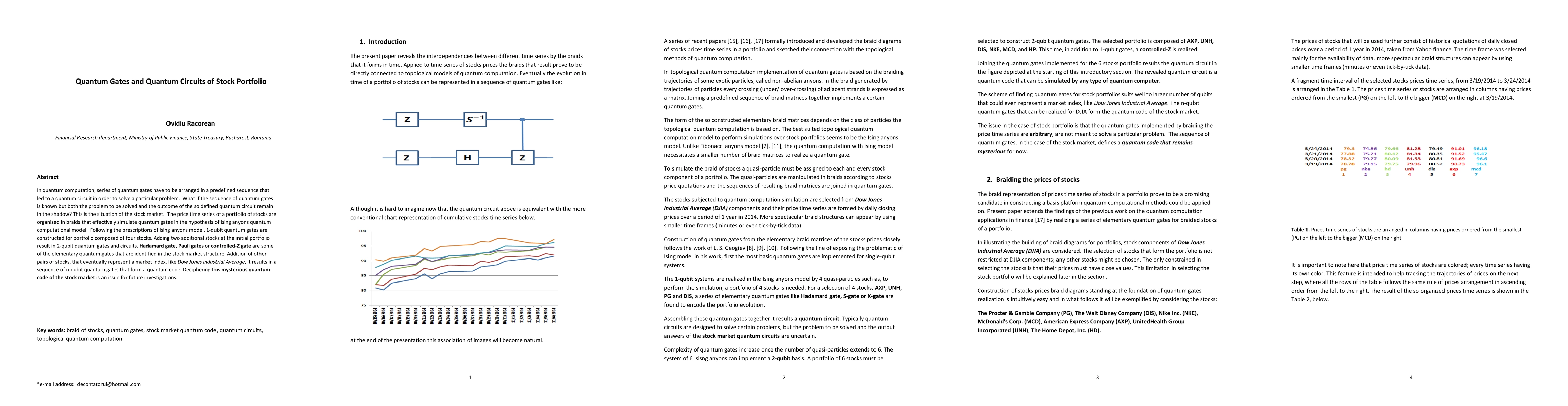 This paper explores how the price time series of a stock portfolio can be modeled using quantum gates and circuits, specifically within the Ising anyons quantum computational framework. It constructs 1-qubit and 2-qubit quantum gates for portfolios of four and six stocks respectively, and suggests that the stock market's structure can be interpreted as a quantum code, hinting at future research to decipher this code.