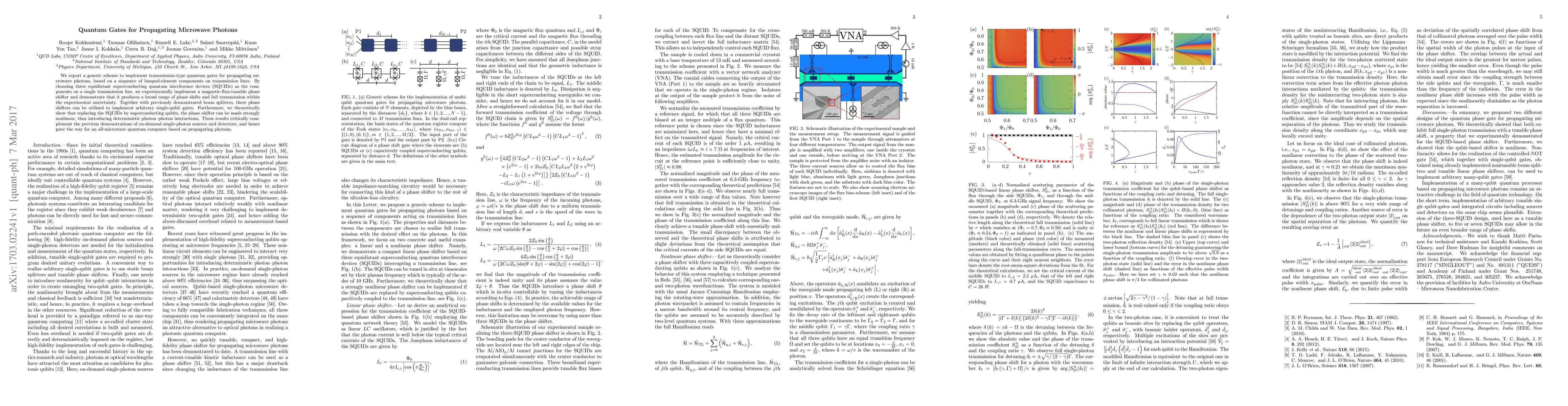 We report a generic scheme to implement transmission-type quantum gates for propagating microwave photons, based on a sequence of lumped-element components on transmission lines. By choosing three equidistant superconducting quantum interference devices (SQUIDs) as the components on a single transmission line, we experimentally implement a magnetic-flux-tunable phase shifter and demonstrate that it produces a broad range of phase shifts and full transmission within the experimental uncertainty. Together with previously demonstrated beam splitters, these phase shifters can be utilized to implement arbitrary single-qubit gates. Furthermore, we theoretically show that replacing the SQUIDs by superconducting qubits, the phase shifter can be made strongly nonlinear, thus introducing deterministic photon--photon interactions. These results critically complement the previous demonstrations of on-demand single-photon sources and detectors, and hence pave the way for an all-microwave quantum computer based on propagating photons.