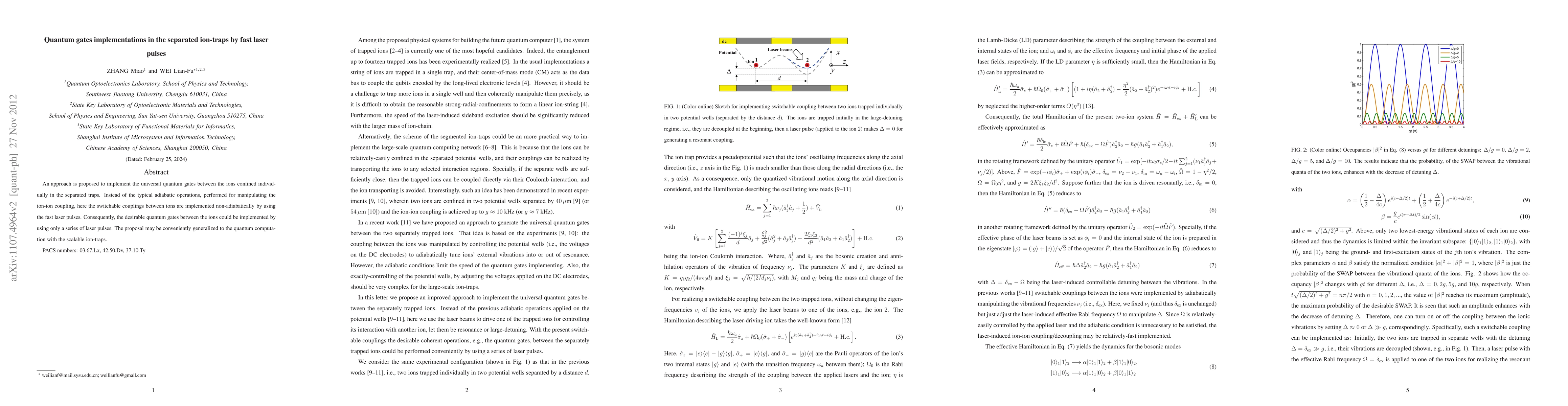 An approach is proposed to implement the universal quantum gates between the ions confined individually in the separated traps. Instead of the typical adiabatic operations, performed for manipulating the ion-ion coupling, here the switchable couplings between ions are implemented non-adiabatically by using the fast laser pulses. Consequently, the desirable quantum gates between the ions could be implemented by using only a series of laser pulses. The proposal may be conveniently generalized to the quantum computation with the scalable ion-traps.