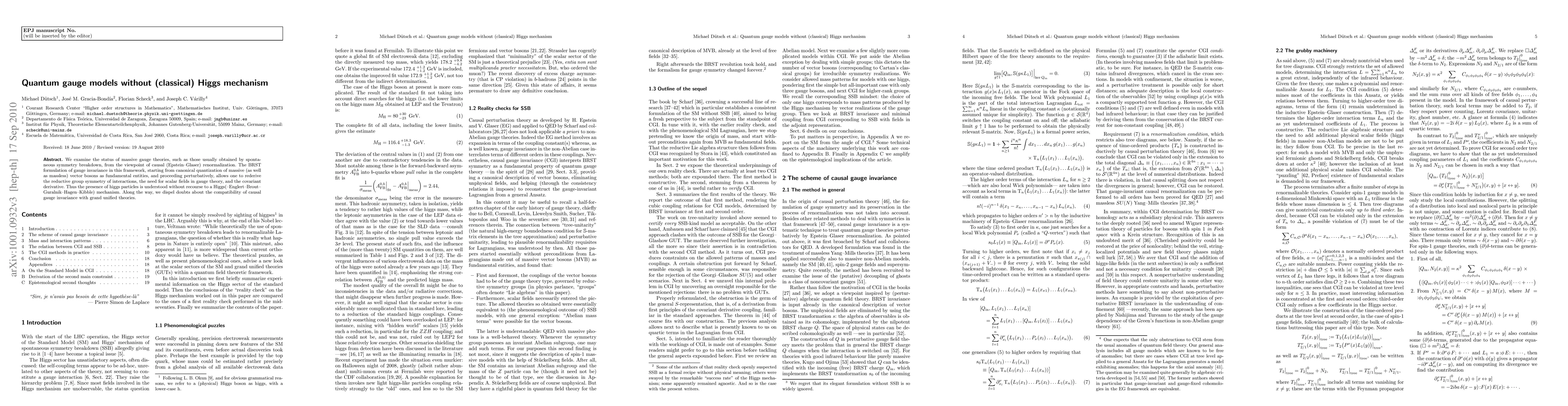 We examine the status of massive gauge theories, such as those usually obtained by spontaneous symmetry breakdown, from the viewpoint of causal (Epstein-Glaser) renormalization. The BRS formulation of gauge invariance in this framework, starting from canonical quantization of massive (as well as massless) vector bosons as fundamental entities, and proceeding perturbatively, allows one to rederive the reductive group symmetry of interactions, the need for scalar fields in gauge theory, and the covariant derivative. Thus the presence of higgs particles is explained without recourse to a Higgs(-Englert-Brout-Guralnik-Hagen-Kibble) mechanism. Along the way, we dispel doubts about the compatibility of causal gauge invariance with grand unified theories.