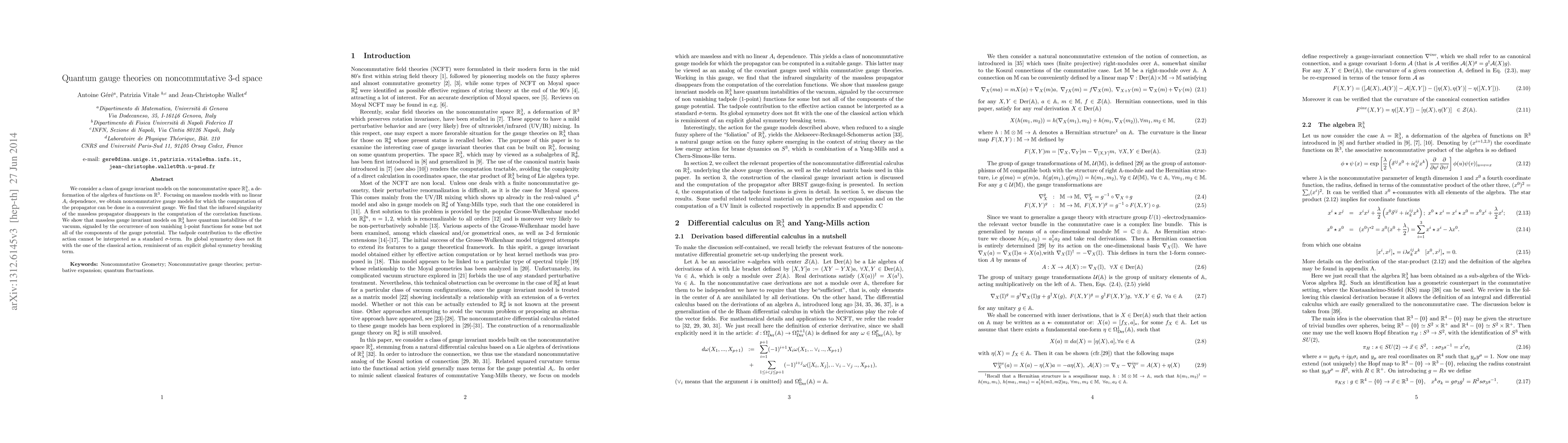 We consider a class of gauge invariant models on the noncommutative space $\mathbb{R}^3_\lambda$, a deformation of $\mathbb{R}^3$. Focusing on massless models with no linear $A_i$ dependence, we obtain noncommutative gauge models for which the computation of the propagator can be done in a convenient gauge. We find that the infrared singularity of the massless propagator disappears in the computation of the correlation functions. We show that massless gauge invariant models on $\mathbb{R}^3_\lambda$ have quantum instabilities of the vacuum, signaled by the occurrence of non vanishing 1-point functions for some but not all of the components of the gauge potential. The tadpole contribution to the effective action cannot be interpreted as a standard $\sigma$-term. Its global symmetry does not fit with the one of the classical action, reminiscent to an explicit global symmetry breaking term.