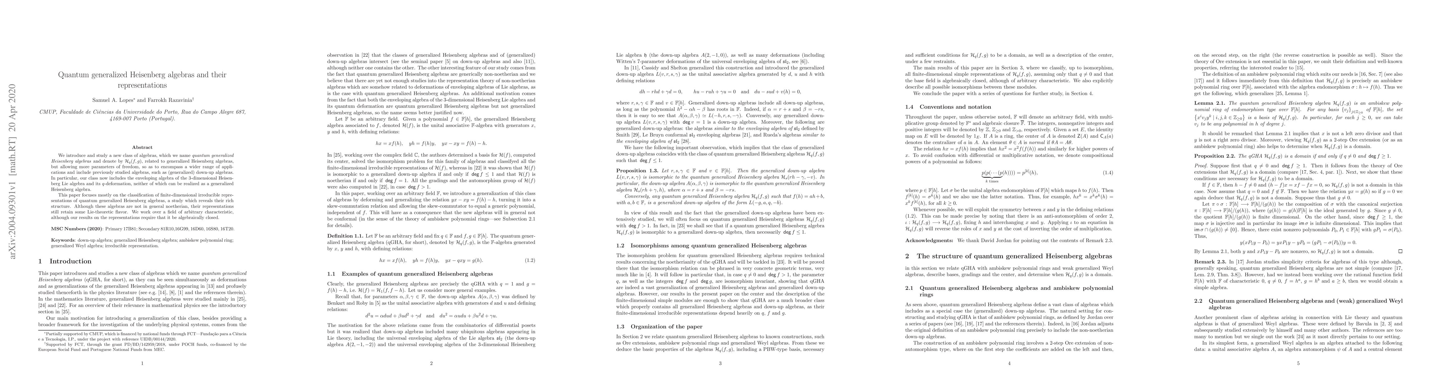 We introduce and study a new class of algebras, which we name \textit{quantum generalized Heisenberg algebras} and denote by $\mathcal{H}_q (f,g)$, related to generalized Heisenberg algebras, but allowing more parameters of freedom, so as to encompass a wider range of applications and include previously studied algebras, such as (generalized) down-up algebras. In particular, our class now includes the enveloping algebra of the $3$-dimensional Heisenberg Lie algebra and its $q$-deformation, neither of which can be realized as a generalized Heisenberg algebra. This paper focuses mostly on the classification of finite-dimensional irreducible representations of quantum generalized Heisenberg algebras, a study which reveals their rich structure. Although these algebras are not in general noetherian, their representations still retain some Lie-theoretic flavor. We work over a field of arbitrary characteristic, although our results on the representations require that it be algebraically closed.