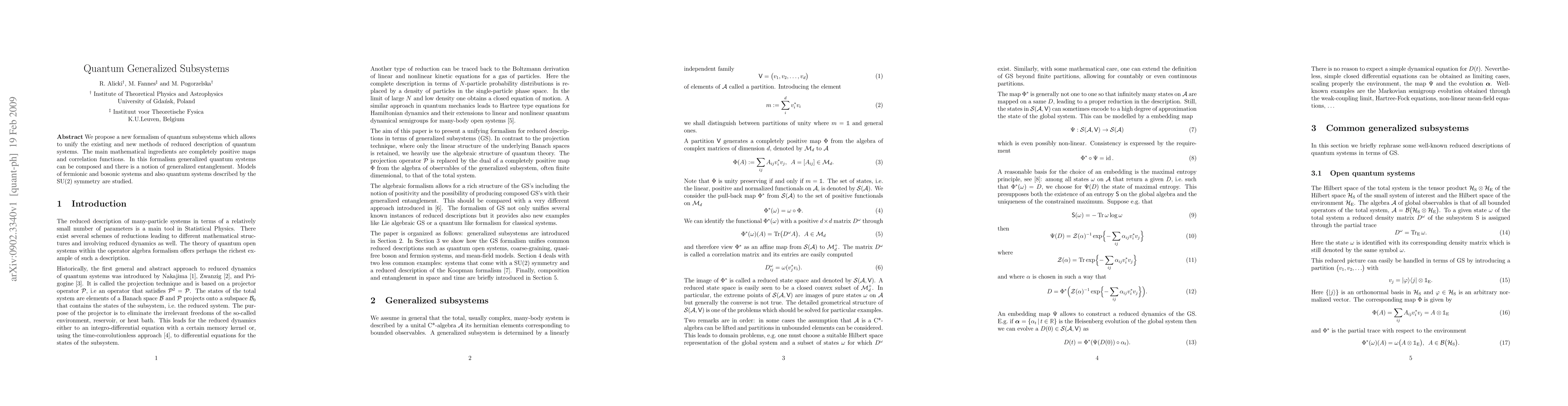This paper introduces a new formalism for quantum subsystems using completely positive maps and correlation functions, aiming to unify various methods of reduced quantum descriptions. It explores generalized entanglement and applies the framework to fermionic, bosonic, and SU(2) symmetric quantum systems.