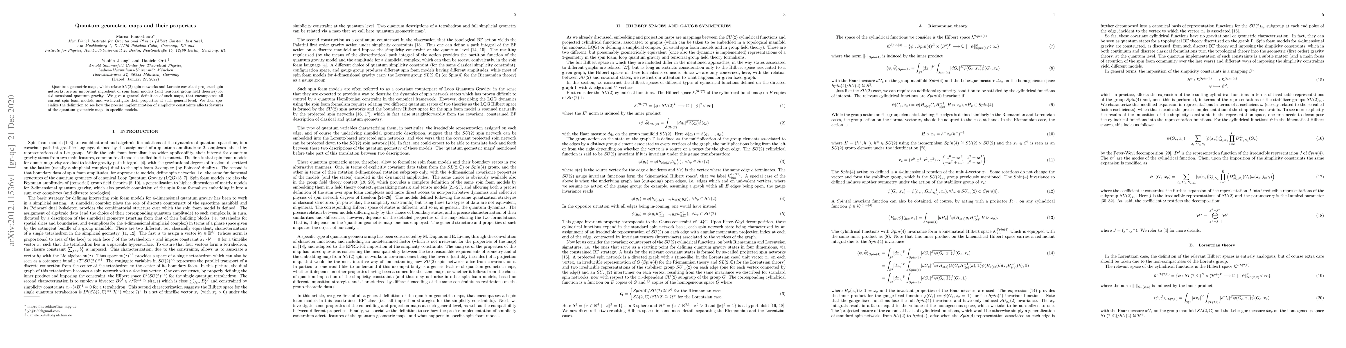 Quantum geometric maps, which relate SU(2) spin networks and Lorentz covariant projected spin networks, are an important ingredient of spin foam models (and tensorial group field theories) for 4-dimensional quantum gravity. We give a general definition of such maps, that encompasses all current spin foam models, and we investigate their properties at such a general level. We then specialize the definition to see how the precise implementation of simplicity constraints affects features of the quantum geometric maps in specific models.