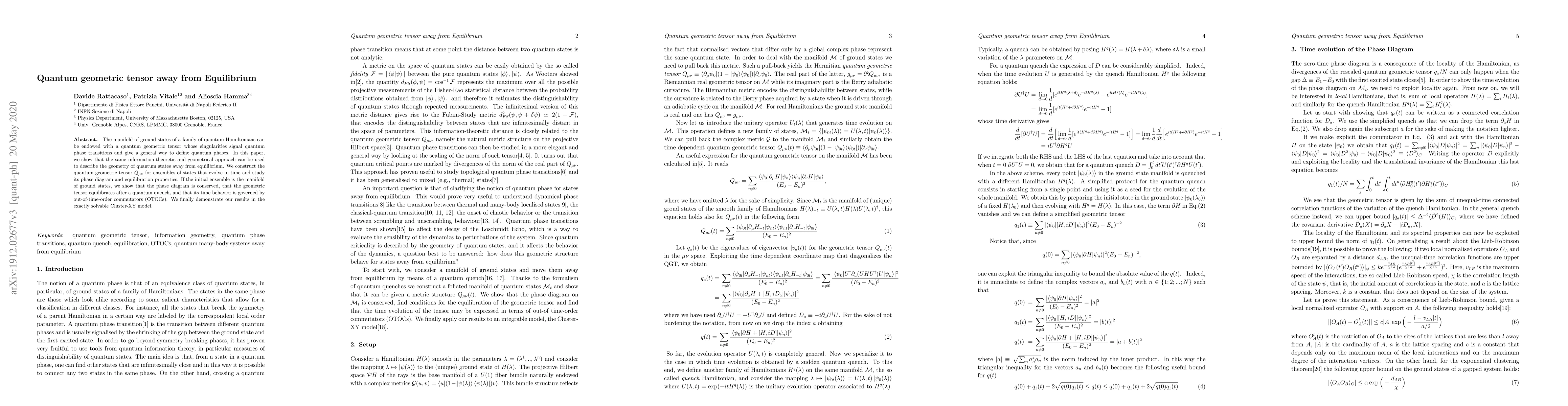 The manifold of ground states of a family of quantum Hamiltonians can be endowed with a quantum geometric tensor whose singularities signal quantum phase transitions and give a general way to define quantum phases. In this paper, we show that the same information-theoretic and geometrical approach can be used to describe the geometry of quantum states away from equilibrium. We construct the quantum geometric tensor $Q_{\mu\nu}$ for ensembles of states that evolve in time and study its phase diagram and equilibration properties. If the initial ensemble is the manifold of ground states, we show that the phase diagram is conserved, that the geometric tensor equilibrates after a quantum quench, and that its time behavior is governed by out-of-time-order commutators (OTOCs). We finally demonstrate our results in the exactly solvable Cluster-XY model.