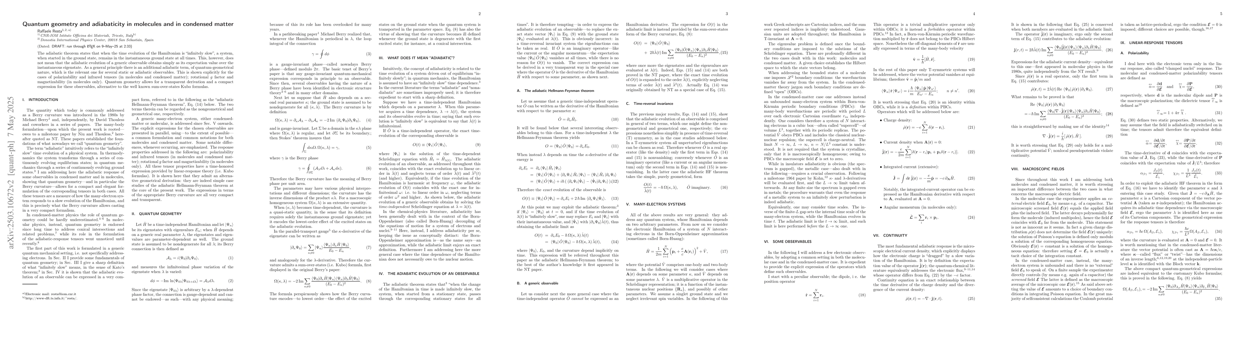 The research presents a comprehensive analysis of quantum geometry and adiabaticity in molecules and condensed matter, deriving transparent expressions for observables such as polarizability, infrared tensors, rotational g factor, and magnetizability using quantum geometrical principles, as alternatives to traditional Kubo formulas.